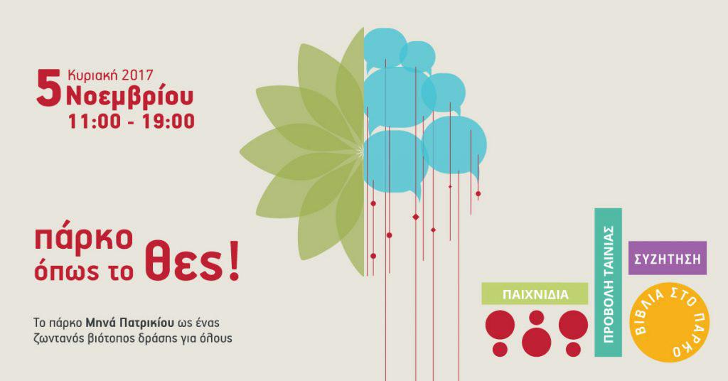 Σε συνέχεια των εργαστηρίων συμμετοχικού σχεδιασμού της Ε’ κοινότητας σε συνεργασία με πολίτες και διάφορες υπηρεσίες του Δήμου Θεσσαλονίκης, διοργανώνεται στην Κυριακή 5 Νοεμβρίου 2017 μια πολυδύναμη εκδήλωση στο Πάρκο Μηνά Πατρικίου, προκειμένου να δοκιμαστεί σε πιλοτικό επίπεδο η ανανεωμένη διαδικασία αδειοδότησης χρήσης του δημόσιου χώρου που σχεδιάστηκε για τη διευκόλυνση των πολιτών στην υλοποίηση πολιτιστικών, αθλητικών δράσεων και παρεμβάσεων μικρής κλίμακας μέσα στην πόλης μας, καθώς και η ενεργοποίηση των πολιτών για εναλλακτικές χρήσεις του πάρκου.