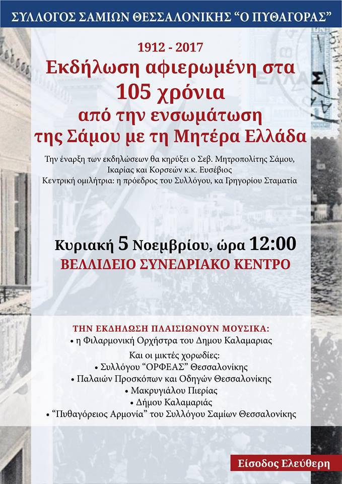 Η Φιλαρμονική ορχήστρα καθώς και η μικτή χορωδία του Δήμου Καλαμαριάς, πλαισιώνουν την εκδήλωση για τα 105 χρόνια από την ενσωμάτωση της Σάμου με την Μητέρα Ελλάδα, στο Βελλίδειο Συνεδριακό κέντρο, την Κυριακή 5 Νοεμβρίου, στις 12 το μεσημέρι.