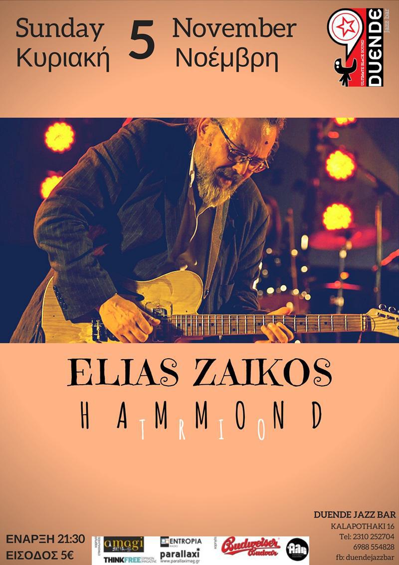 Αυτή την Κυριακή 5 Νοεμβρίου, ο Ηλίας Ζάικος ανεβαίνει στη σκηνή του Duende Jazz Bar για την πρώτη από μια σειρά εμφανίσεων με το Hammond Τrio, όπου θα παρουσιάσει τo δικό του in-fusion των blues με τη jazz. *5 Νοεμβρίου, Duende Jazz Bar, Καλαποθάκη 16, τηλ. 2310252704