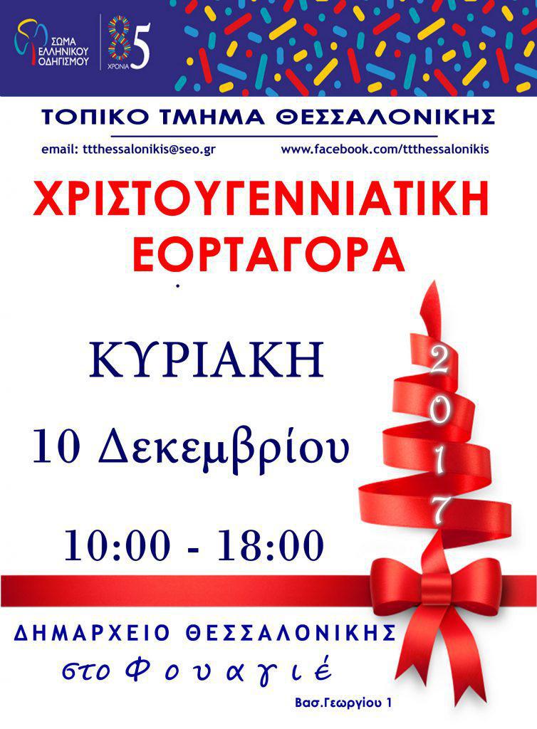 Χριστουγεννιάτικα δώρα, χειροποίητα προϊόντα, γλυκά, λικέρ, σάλτσες, μαρμελάδες, σκουφιά, κασκόλ και άλλα πολλά, φτιαγμένα με κέφι και μεράκι θα βρείτε στην Εορταγορά του Τοπικού Τμήματος Θεσσαλονίκης του Σώματος Ελληνικού Οδηγισμού. Γονείς, παιδιά, παππούδες και γιαγιάδες, φίλοι και όσοι αγαπάτε το Σώμα Ελληνικού Οδηγισμού, που εδώ και 85 χρόνια δραστηριοποιείται στη Θεσσαλονίκη. Σε μια μεγάλη χριστουγεννιάτικη γιορτή – στην χριστουγεννιάτικη εορταγορά μας. Ελάτε να περάσουμε την μέρα μας γιορτινά, να ακούσουμε χριστουγεννιάτικα τραγούδια, να παίξουμε με τα παιδιά, να μας γνωρίσετε και να σας γνωρίσουμε και να υποστηρίξουμε όλοι μαζί την μεγαλύτερη εθελοντική παρέα του κόσμου, τον Οδηγισμό.
