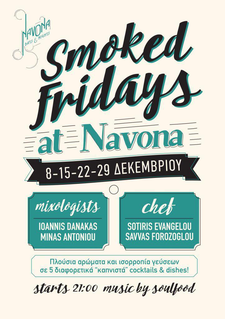 Οι Παρασκευές του Δεκεμβρίου γίνονται Smoked! Με πλούσια αρώματα, ισορροπία γεύσεων και έμπνευση οι Mixologists του Navona ετοιμάζουν για εσάς “καπνιστά” cocktails & dishes, από τα χέρια του Executive Chef Σωτήρη Ευαγγέλου. Smoked Fashioned με παλαιωμένο ουίσκι, χειροποίητο σιρόπι κολιάνδρου και bitters πορτοκαλιού συνοδεύετε με μπρουσκέτα, μπλε τυρί και καραμελωμένα αχλάδια. Negroni με τζιν, γλυκό βερμούτ και premium gin συνοδεύετε με πιαντίνα, μους μορταδέλας και γλυκά βερίκοκα. Αυτές είναι μόνο 2 από τις 5 διαφορετικές “καπνιστές” επιλογές που θα σας μυήσουν στην απόλαυση των μοναδικών αυτών συνδυασμών. Απολαύστε τη μοναδική πολυπλοκότητά των γεύσεων παρέα με τους Soul Food που πίσω από το booth μαγειρεύουν τους jazz ήχους της Νέας Ορλεάνης και έρχονται να ταιριάξουν αρμονικά τις καπνιστές αλλά παράλληλα πιπεράτες γεύσεις.