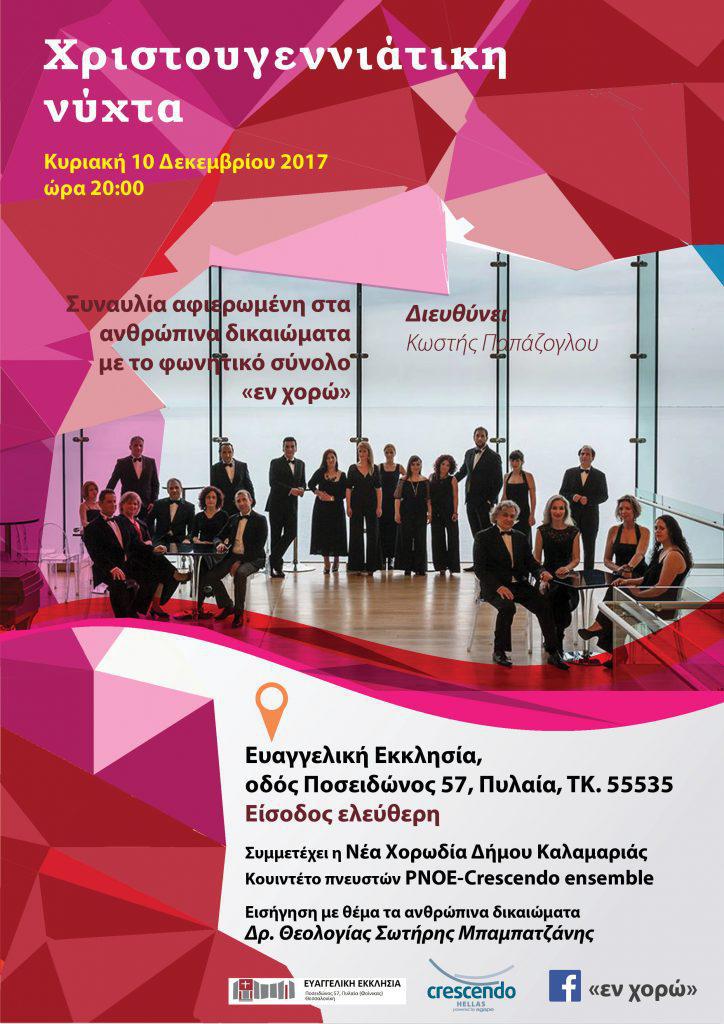 Μια συναυλία αφιερωμένη στα ανθρώπινα δικαιώματα θα πραγματοποιηθεί την Κυριακή 10 Δεκεμβρίου, ώρα 8 μ.μ. στην Ευαγγελική Εκκλησία της οδού Ποσειδώνος στην Πυλαία Θεσσαλονίκης. Το φωνητικό σύνολο «εν χορώ» που ειδικεύεται στην ερμηνεία παλαιάς και σύγχρονης θρησκευτικής μουσικής θα παρουσιάσει το έργο του D.Buxtehude “in dulci jubilo” με τη συνοδεία μελών της Καμεράτα Αριστοτέλης. Θα ακουστούν επίσης Χριστουγεννιάτικα κομμάτια από το διεθνές ρεπερτόριο, καθώς και ελληνικά. Συμμετέχει και η Νέα Χορωδία του Δήμου Καλαμαριάς. Διευθύνει ο Κωστής Παπάζογλου. Ο Σωτήρης Μπαμπατζάνης, Δρ. Θεολογίας θα κάνει μια εισήγηση πάνω στο θέμα με τίτλο «Ανθρώπινα δικαιώματα, αγάπης υποχρεώσεις»