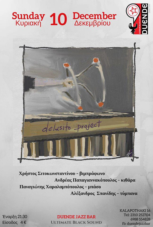 Το Duende Jazz Bar παρουσιάζει το Delasito Project, μια φιλόδοξη προσπάθεια-όχημα καλλιτεχνικής έκφρασης του Χρήστου Σιτοκωνσταντίνου από το Βόλο. Ο Χρήστος Σιτοκωνσταντίνου είναι κλασικός κρουστός. Ξεκίνησε τις σπουδές του στο Δημοτικό Ωδείο Βόλου (τάξη Αλ. Χρηστίδη) και στο Σύγχρονο Ωδείο Θες/νίκης (τάξη Κ. Χανή). Έχει γράψει πρωτότυπη μουσική για θεατρικές παραστάσεις («Εκκένωση», σκηνοθεσία Ν. Φυτά κ.ά) και παραστάσεις σύγχρονου χορού(«10 βήματα και κάτι»,χορογραφίες Δ. Παπανικολάου κ.ά). Στο πλαίσιο του Φεστιβάλ Βολου 2017,πραγματοποίησε το σεμινάριο «Περιμένοντας τον κρουστό» , όπου δημιουργήθηκε η ομώνυμη μουσική ομάδα με συμμετοχές σε διάφορα φεστιβάλ. Έχει υπάρξει μέλος ορχηστρών (Κ.Ο.Θ., Δ.Ο.Θ., Συμφωνική Δήμου Βόλου), ιδρυτικό μέλος διαφόρων σχημάτων κρουστών όπως η Κρουστωδία, το Percaddiction, καθώς και του ska reggae σχήματος Band Fatale. Το Delasito project μετά τη συμμετοχή του στο 1ο Volos jazz festival και το 6ο ΚΟΘ Underground, συνεχίζει τις εμφανίσεις του. Αποτελούμενο από μέλη που ζουν και εργάζονται στο Βόλο, την Αθήνα και τη Θεσσαλονίκη και με οδηγό τον ιδιαίτερο και ατμοσφαιρικό ήχο του βιμπράφωνου, παρουσιάζει ένα ρεπερτόριο από διασκευές και πρωτότυπες δημιουργίες, που βασίζονται τόσο σε επιρροές από την jazz και funk σκηνή όσο και από την κλασική μουσική και τον ελεύθερο αυτοσχεδιασμό. Υπόγειοι αρμονικοί σιδηρόδρομοι, βήματα αυτοσχεδιασμού με το κοινό, ψυχεδελικό μπαλέτο, θυσία γαλλικών δοξαριών στο βωμό του πειραματισμού είναι βασικά στοιχεία που συνθέτουν την ατμόσφαιρα της ζωντανής εμφάνισής του.