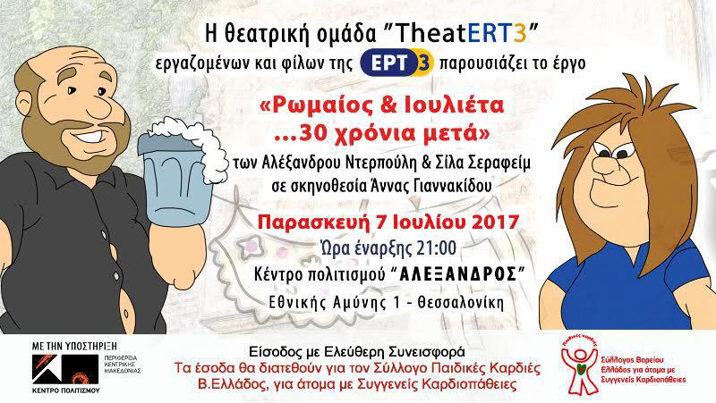 Η θεατρική ομάδα TheatERT3, που αποτελείται από εργαζόμενους και φίλους της ΕΡΤ3, παρουσιάζει την κωμωδία του Αλέξανδρου Ντερπούλη και του Σεραφείμ Σίλα «Ρωμαίος και Ιουλιέτα…30 χρόνια μετά». Η σκηνοθεσία είναι της Άννας Γιαννακίδου και τα σκηνικά της Κωνσταντίας Δίγκα. Η είσοδος είναι με ελεύθερη συνεισφορά και -μετά την ευχάριστη είδηση για τη συγκέντρωση του απαραίτητου ποσού για τον μικρό Νέστορα -τα έσοδα θα διατεθούν στον Σύλλογο Παιδικές Καρδιές Β. Ελλάδος, για παιδιά με συγγενείς καρδιοπάθειες.