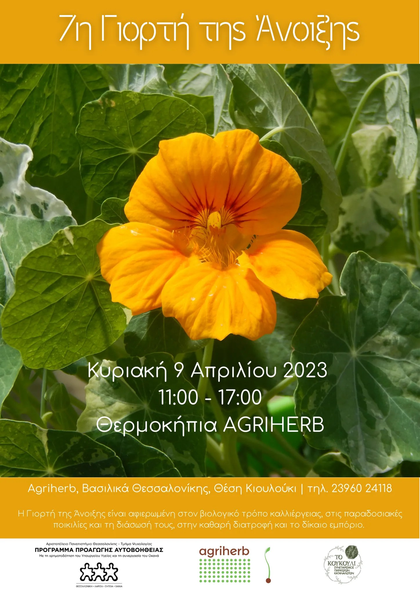 Το Πρόγραμμα Προαγωγής Αυτοβοήθειας και η Agriherb σε συνεργασία με το Συνεταιρισμό Κουκούλι διοργανώνουν την Κυριακή 9 Απριλίου την 7η Γιορτή της Άνοιξης που θα λάβει χώρα στα θερμοκήπια Agriherb, στα Βασιλικά Θεσσαλονίκης, στη θέση Κιουλούκι.