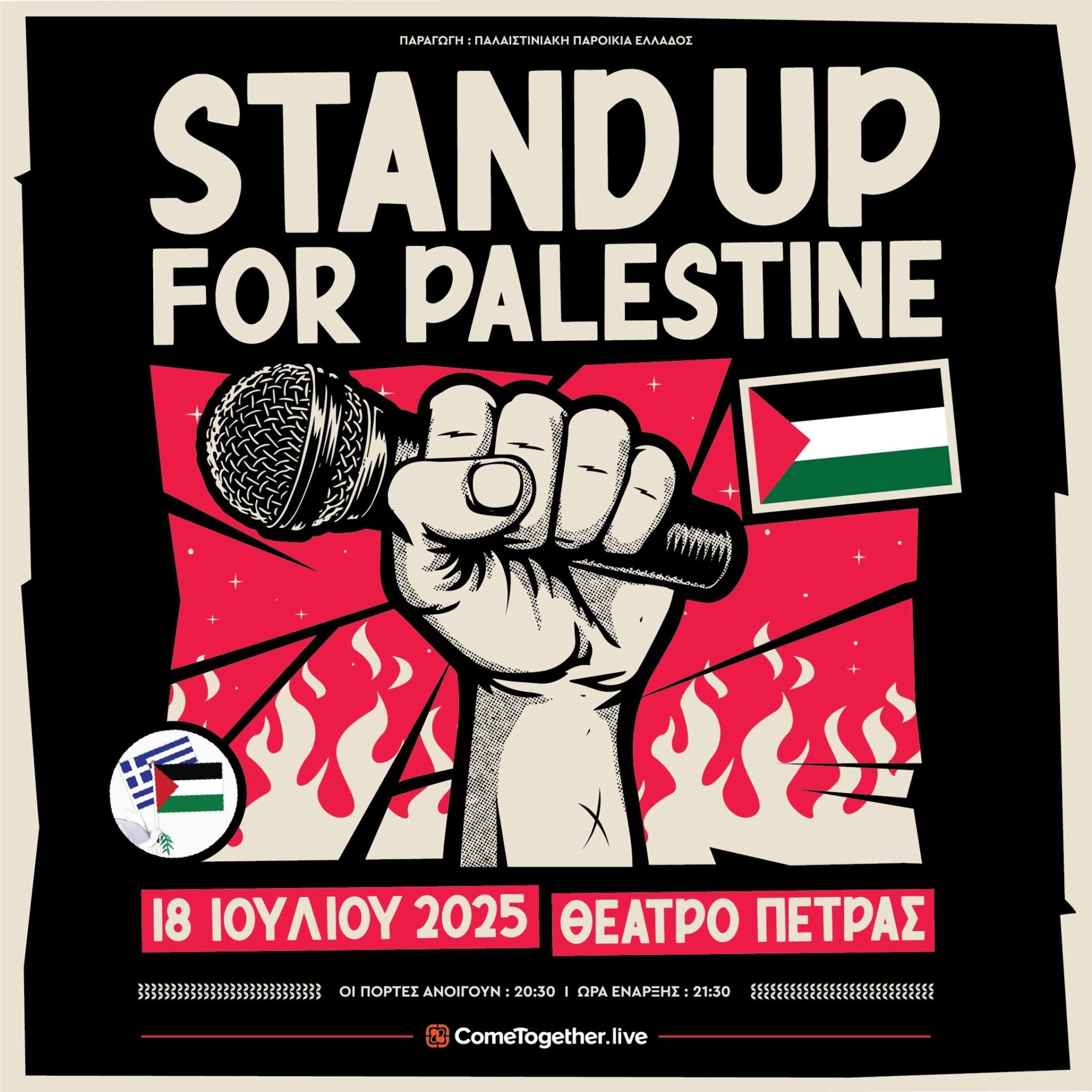 Στην εκδήλωση «Stand Up for Palestine» στο Θέατρο Πέτρας, την Παρασκευή 18 Ιουλίου 2025, 24 από τους αγαπημένους μας Έλληνες κωμικούς θα ενώσουν τις φωνές τους στην stand up σκηνή, σε μία βραδιά αλληλεγγύης, όπου το γέλιο θα γίνει εργαλείο ελπίδας και προσφοράς.