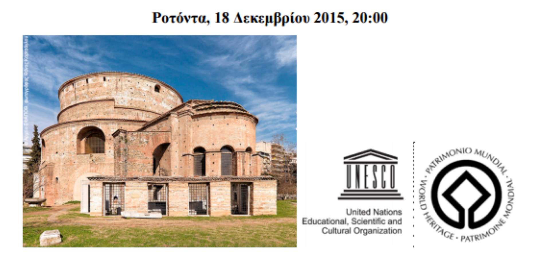 *Τόπος: Ροτόντα Ημερομηνία: 18 Δεκεμβρίου 2015 Ώρα έναρξης: 20:00 Είσοδος: (Δ. Πύλη οδ. Φιλίπππου) ελεύθερη, θα τηρηθεί σειρά προτεραιότητας Πληροφορίες: Μαρία Καγιαδάκη, 2310 204868