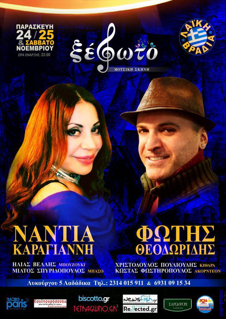 Γι’ αυτή την Παρασκευή 24 και το Σάββατο 25 Νοεμβρίου, το ΞΕΦΩΤΟ (Λυκούργου 5, Λαδάδικα), έχει πρόταση. Για ξενύχτι όσο μας…πάρει, για τραγούδι και ξεφάντωμα, για νταλγκά και καλή παρέα. Το «πρόσταγμα» δίνουν η Νάντια Καραγιάννη και ο Φώτης Θεοδωρίδης. Η ιδιαίτερη φωνή της Νάντιας Καραγιάννη, της αδελφής του Μπάμπη Τσέρτου, ενώνεται στο πάλκο με την αισθαντική φωνή του Φώτη Θεοδωρίδη για «νύχτες μαγικές κι ονειρεμένες» που θα μας… πάνε «στων Αγγέλων τα μπουζούκια» Μαζί τους, τέσσερις εξαιρετικοί μουσικοί: Ο Ηλίας Βελλής στο μπουζούκι, ο Μίλτος Σπυριδόπουλος στο μπάσο, ο Χριστόδουλος Πουλιούδης στην κιθάρα και ο Κώστας Φωστηρόπουλος στο ακορντεόν. Παρασκευή και Σάββατο στο ΞΕΦΩΤΟ έρχονται βραδιές μιας άλλης φιλοσοφίας. Απευθύνονται σε όλους όσοι αγαπούν το λαϊκό και ρεμπέτικο τραγούδι, όσοι επιζητούν την εγγύτητα στη διασκέδαση, τη λιτότητα στην αισθητική. Ένα βήμα, κυριολεκτικά, από τους καλλιτέχνες, όλοι γίνονται μια παρέα και τα τραγούδια των μεγάλων μας δημιουργών, του Β.Τσιτσάνη, του Απ.Καλδάρα, του Α.Πάνου, του Γ.Ζαμπέτα, του Μ.Θεοδωράκη , του Μ. Λοΐζου και πολλών άλλων, έρχονται αυθόρμητα στα χείλη όλων, ψιθυριστά και κάποιες στιγμές δυνατότερα.
