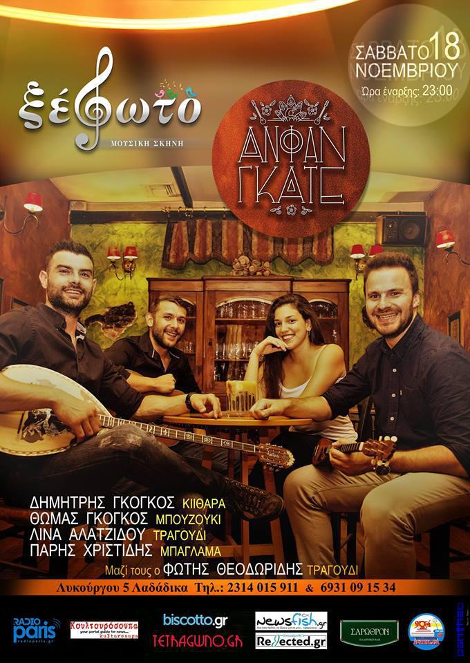 Αλήθεια, τι συμβαίνει όταν οι «νέοι» που «είναι ωραίοι», σμίγουν με το «παλιό» που είναι «αλλιώς»; Η απάντηση θα δοθεί το Σάββατο 18 Νοεμβρίου στο ΞΕΦΩΤΟ(Λυκούργου 5, Λαδάδικα), όταν οι «νέοι» Ανφάν Γκατέ, σμίγουν με το ρεμπέτικο που είναι παλιό, ωστόσο διαχρονικό.