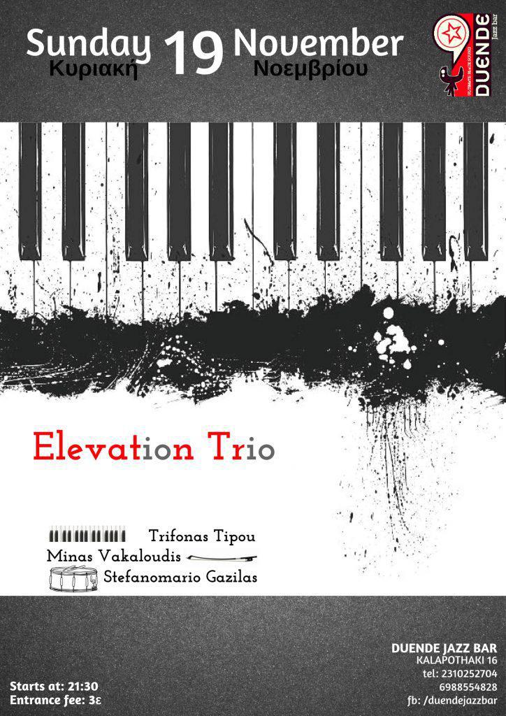 Το Elevation Trio δημιουργήθηκε το 2015 απο τρείς αποφοίτους του Μουσικού Σχολείου Θεσσαλονίκης και νυν συμφοιτητές στο Κρατικό Ωδείο. Ασχολείται κυρίως με την σύνθεση πρωτότυπης μουσικής. Με επιρροές απο διάφορα είδη μουσικής, με κύριο γνώμονα τον αυτοσχεδιασμό, οι συνθέσεις τους είναι αποτέλεσμα του παντρέματος των διαφορετικών μουσικών τους καταβολών. Το καλοκαίρι του 2016 ηχογράφησαν τον πρώτο τους δίσκο με τίτλο: “Beyond The Sea”, τον οποίον και παρουσίασαν στην αίθουσα Μελίνα Μερκούρη του Κρατικού Ωδείου Θεσσαλονίκης. Έχουν εμφανιστεί σε διάφορους χώρους και φεστιβάλ σε Αθήνα και Θεσσαλονίκη (”Πικ Νικ UrbaN Festival”, ”Your Band At Ert”, ”Sofar Sounds Thessaloniki κ.α). Την Κυριακή 19 Νοεμβρίου, στο Duende Jazz Bar, θα παρουσιάσουν κομμάτια απο τον δίσκο τους, καθώς και νέες συνθέσεις απο την επερχόμενη δισκογραφική τους δουλειά.