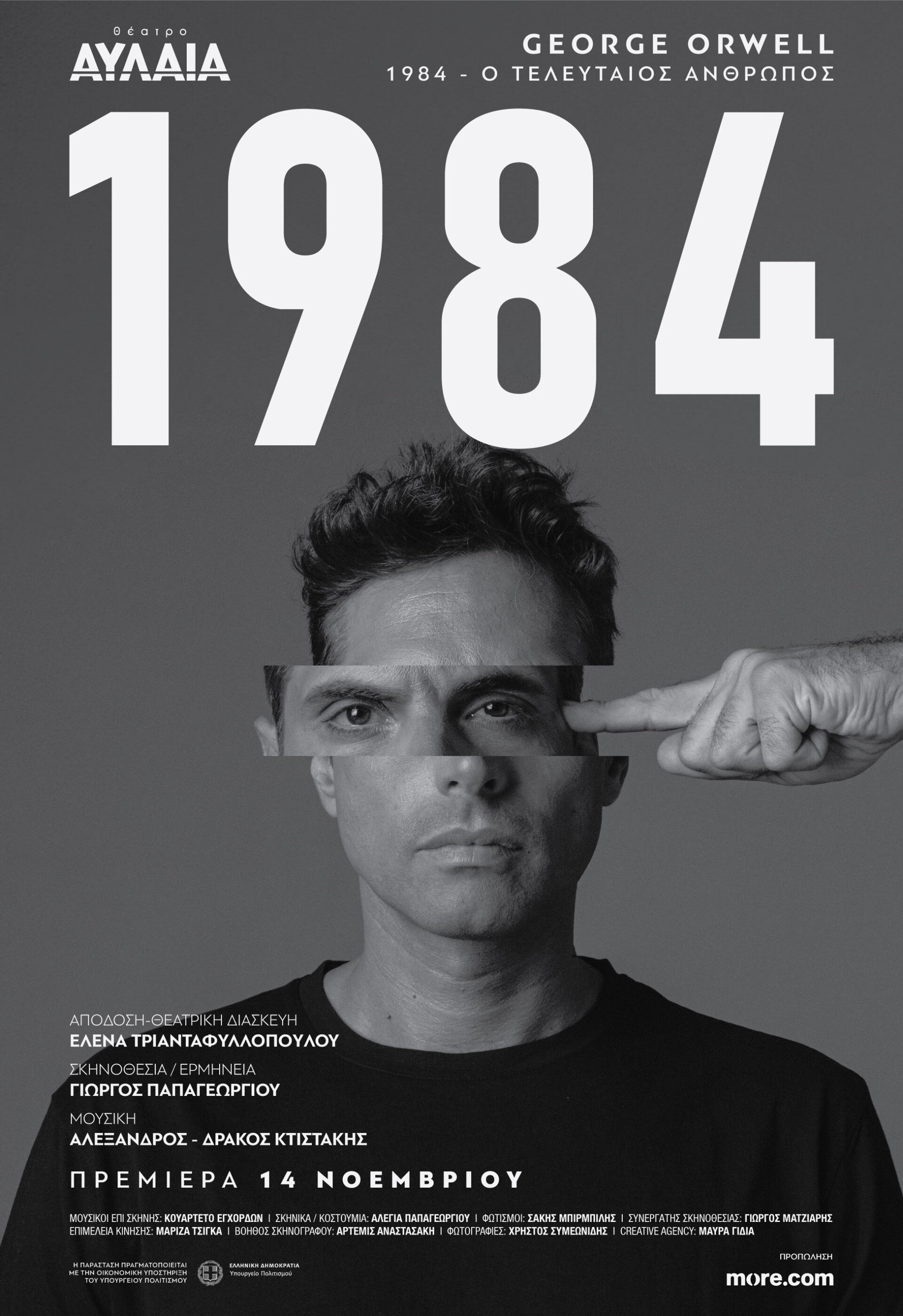 Ο Γιώργος Παπαγεωργίου μετά την θρυλική παράσταση του «Αρίστου», επιστρέφει στη Θεσσαλονίκη για την πολυαναμενόμενη πρεμιέρα του «1984». Έχοντας δίπλα του τον Αλέξανδρο-Δράκο Κτιστάκη στη μουσική σύνθεση και την Έλενα Τριανταφυλλοπούλου στη διασκευή και τη μετάφραση του προφητικού έργου του Όργουελ. Η πρωτότυπη ζωντανή μουσική ερμηνεύεται από ένα κουαρτέτο εγχόρδων επί σκηνής.