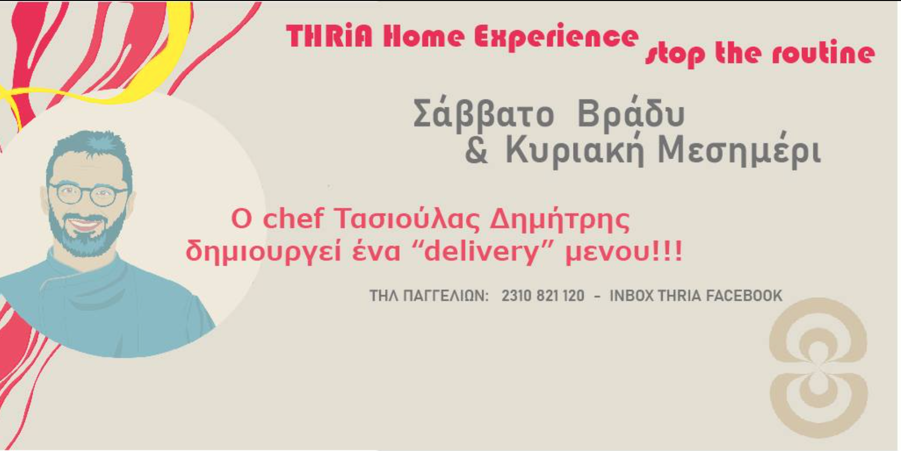 Ο σπουδαίος chef Τασιούλας Δημήτρης, του αγαπημένου μας εστιατορίου THRiA δημιουργεί ένα απολαυστικό ολοκληρωμένο delivery menu, για εσένα που σου έχει λείψει το καλό φαγητό έξω. Η εμπειρία της γαστρονομίας στο σπίτι σας αυτό το Σαββατοκύριακο.