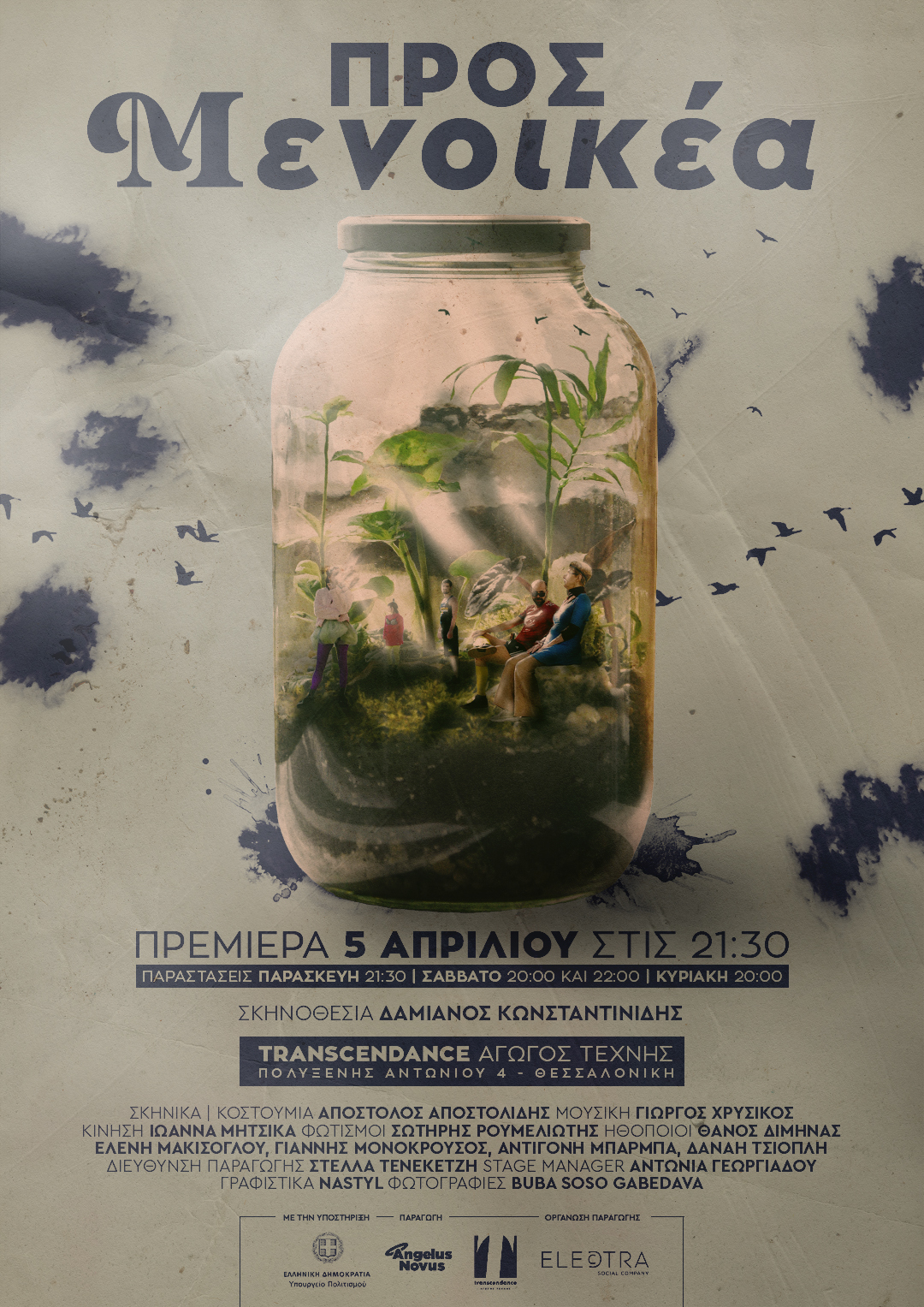 Σταθεροί μένουν και συνεργάτες όπως η Ιωάννα Μήτσικα που διαχειρίστηκε πετυχημένα την δύσκολη κινησιολογία του έργου, την Αντωνία Γεωργιάδου στο stage management και τον Σωτήρη Ρουμελιώτη στο φωτισμό. Ένα άλλο από τα ιδιαίτερα χαρακτηριστικά της ομάδας είναι η συνειδητή απόφαση να μην παίζουν στις γνωστές θεατρικές σκηνές της πόλης αλλά να μας συστήνουν νέους χώρους. Μετά την sold out πρεμιέρα το «Προς Μενοικέα» μια παυσίλυπος κωμωδία για τη ψυχική υγεία και την αναζήτηση της ευτυχίας συνεχίζει μέχρι τέλος Απριλίου και δεν πρέπει να την χάσετε.