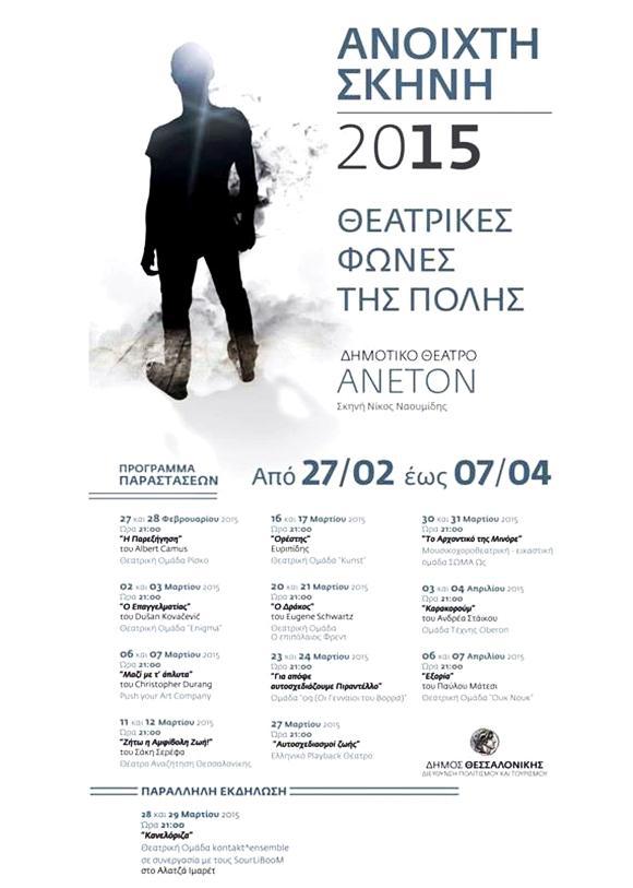 Θεατρική Ομάδα Ρίσκο / «Η Παρεξήγηση» του Albert Camus στις 27 και 28 Φεβρουαρίου Θεατρική Ομάδα «Enigma» / «Ο Επαγγελματίας» του Ντούσαν Κοβάτσεβιτς στις 2 και 3 Μαρτίου «Push your Art Company» / «Μαζί με τ’ άπλυτα» του Christopher Durang στις 6 και 7 Μαρτίου Θέατρο Αναζήτηση / «Ζήτω η Αμφίβολη Ζωή!» του Σάκη Σερέφα στις 11 και 12 Μαρτίου Θεατρική Ομάδα «Kunst» / «Ορέστης» του Ευριπίδη στις 16 και 17 Μαρτίου Αστική μη Κερδοσκοπική Εταιρία «Ο επιπόλαιος Φρεντ» / «Ο Δράκος» στις 20 και 21 Μαρτίου Ομάδα «09 (Οι Γενναίοι του Βορρά)» / «Για απόψε αυτοσχεδιάζουμε Πιραντέλλο» στις 23 και 24 Μαρτίου Ελληνικό Playback Θέατρο / «Αυτοσχεδιασμοί ζωής» στις 27 Μαρτίου 2015 Μουσικοχοροθεατρική – εικαστική ομάδα «ΣΩΜΑ Ως» / «Το Αρχοντικό της Μινόρε» στις 30 και 31 Μαρτίου Ομάδα Τέχνης «Oberon» /«Καρακορούμ» του Ανδρέα Στάικου στις 3 και 4 Απριλίου Θεατρική Ομάδα «Ουκ Νουκ» / «Εξορία» του Παύλου Μάτεσι στις 6 και 7 Απριλίου