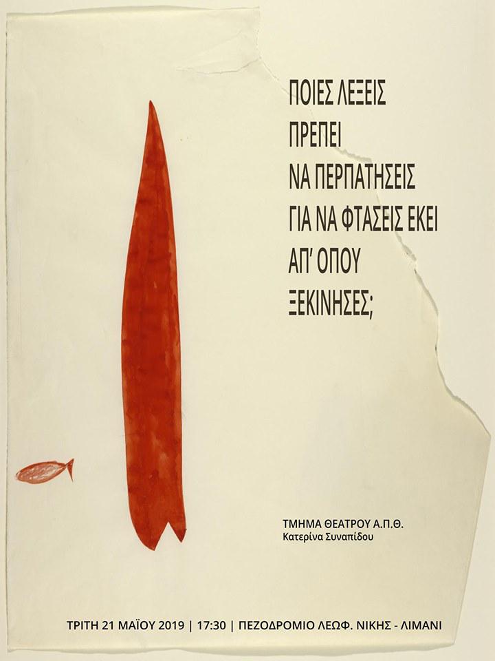 «Ποιες λέξεις πρέπει να περπατήσεις για να φτάσεις εκεί απ΄όπου ξεκίνησες;» από την Κατερίνα Συναπίδου, στις 17.30, έναρξη από το πεζοδρόμιο της Λεωφ. Νίκης, στο ύψος της Δημητρίου Γούναρη με κατάληξη στο Λιμάνι, στο τέρμα της Α’ Προβλήτας, επί της ίδιας οδού.