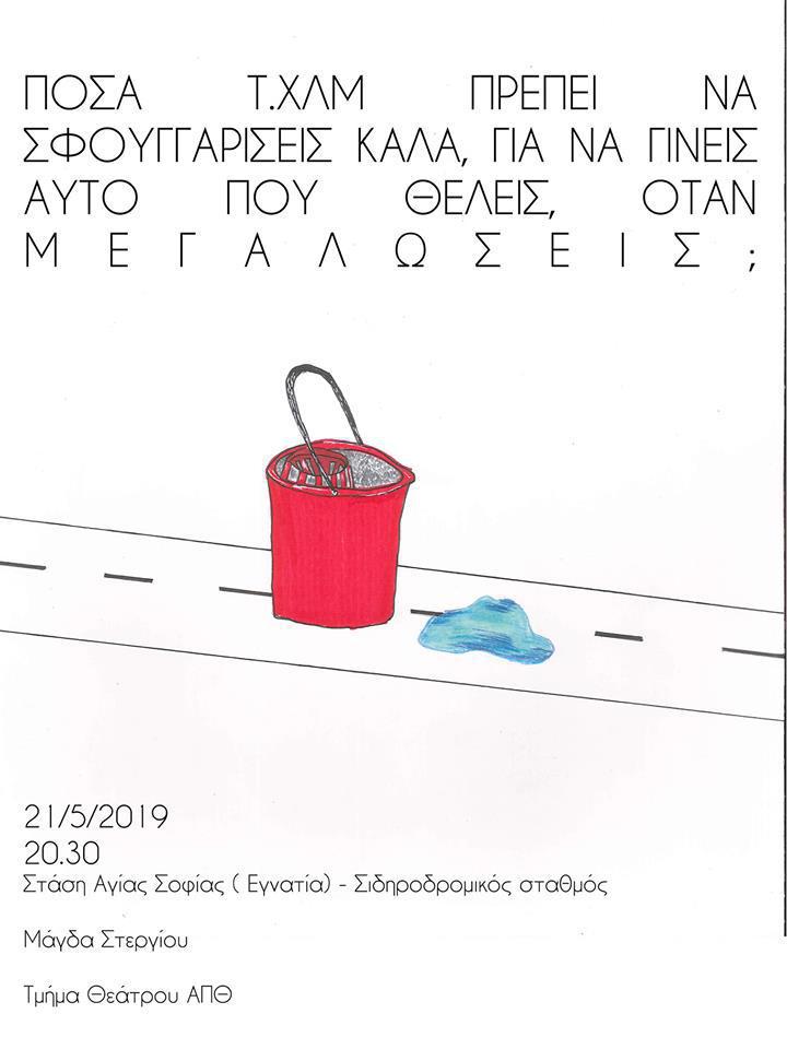 «Πόσα τ.χλμ. πρέπει να σφουγγαρίσεις καλά για να γίνεις αυτό που θέλεις όταν μεγαλώσεις;», από τη Μάγδα Στεργίου, στις 20.30, στη Στάση Αγίας Σοφίας (Εγνατία) – Σιδηροδρομικός Σταθμός.