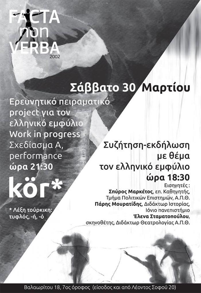 Μια πολύ ιδιαίτερη performance με τον τίτλο «kör» που στην τουρκική γλώσσα σημαίνει τυφλός-η-ο παρουσιάζει η ομάδα Facta Non Verba. Πρόκειται για το σχεδίασμα Α ενός θεατρικού, ερευνητικού και πειραματικού project, work in progress πάνω στον Ελληνικό εμφύλιο πόλεμο.