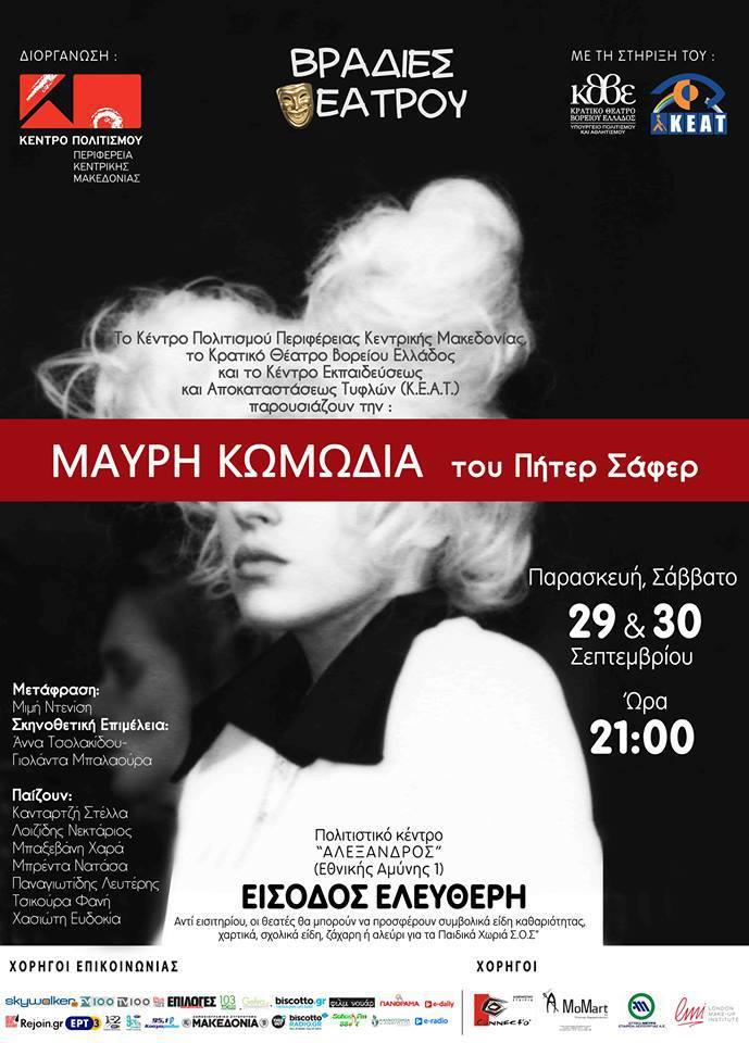 Το Κέντρο Πολιτισμού της Περιφέρειας Κεντρικής Μακεδονίας και το Κρατικό Θέατρο Βορείου Ελλάδος σε συνεργασία με το Κέντρο Εκπαιδεύσεως και Αποκαταστάσεως Τυφλών (Κ.Ε.Α.Τ.), διοργανώνουν την θεατρική παράσταση με τίτλο: «Μαύρη Κωμωδία» του Πήτερ Σάφερ