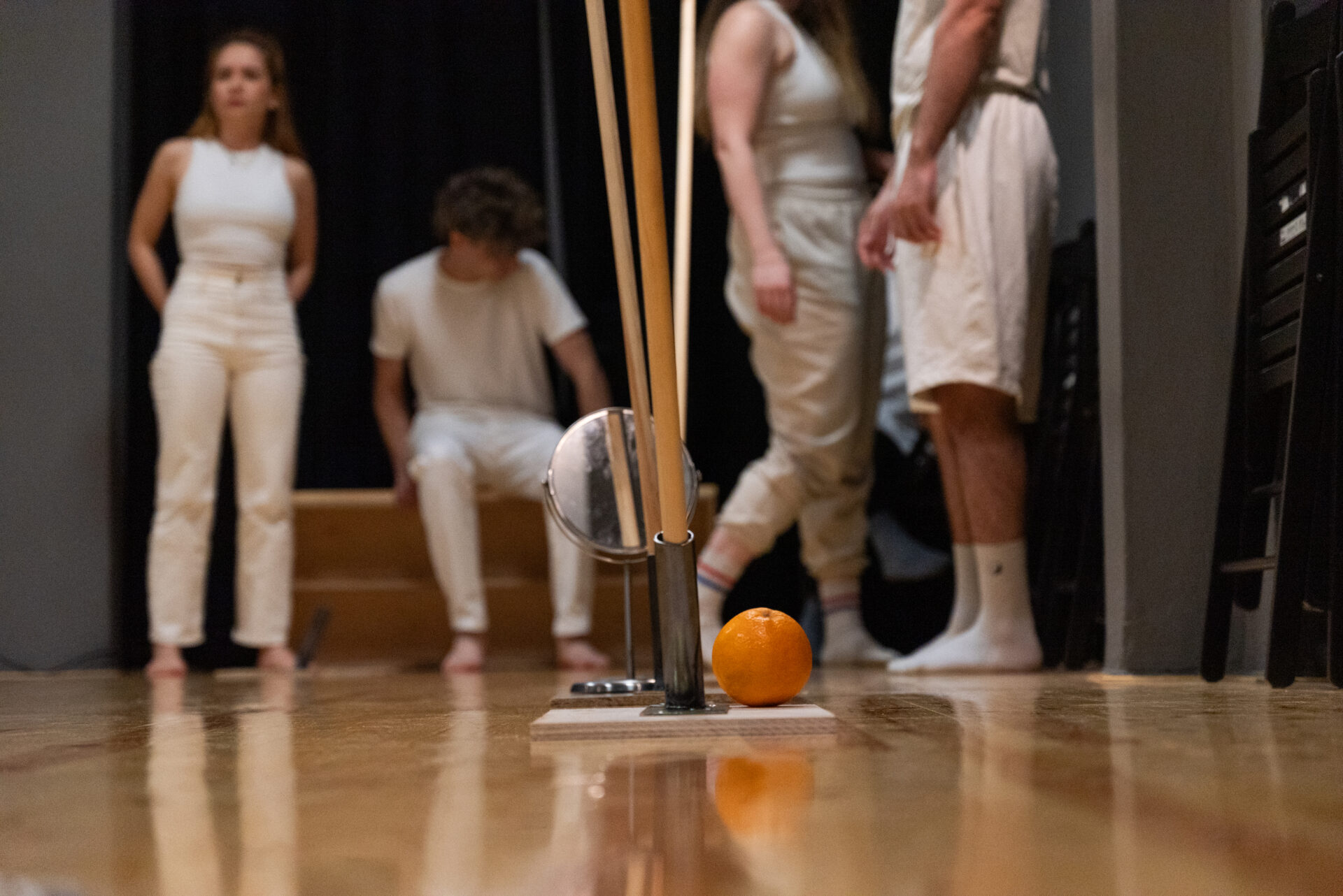 Πέντε άτομα συγκεντρώνονται σε έναν χώρο – κενό, περιμένοντας την τελική αποδοχή τους από τον θάνατο. Σύντομα αποκαλύπτεται ότι ένας από αυτούς, τον οποίο υποδύεται εξαιρετικά ο Αλέξανδρος Νικολαϊδης, είναι αυτός που πρέπει να οδηγήσει τους άλλους στην τελευταία τους θέση ανάπαυσης. Με μοναδική προϋπόθεση να επιλέξουν μία μόνο ανάμνηση τους που θα ζουν στην αιωνιότητα. Τα μόνα στηρίγματα για όλους, είναι μερικά μπαστούνια μπαμπού, ένα πορτοκάλι, τα σώματα και οι φωνές των ηθοποιών που μπλέκονται αριστοτεχνικά με τις μουσικές, τους ήχους και τα φώτα.