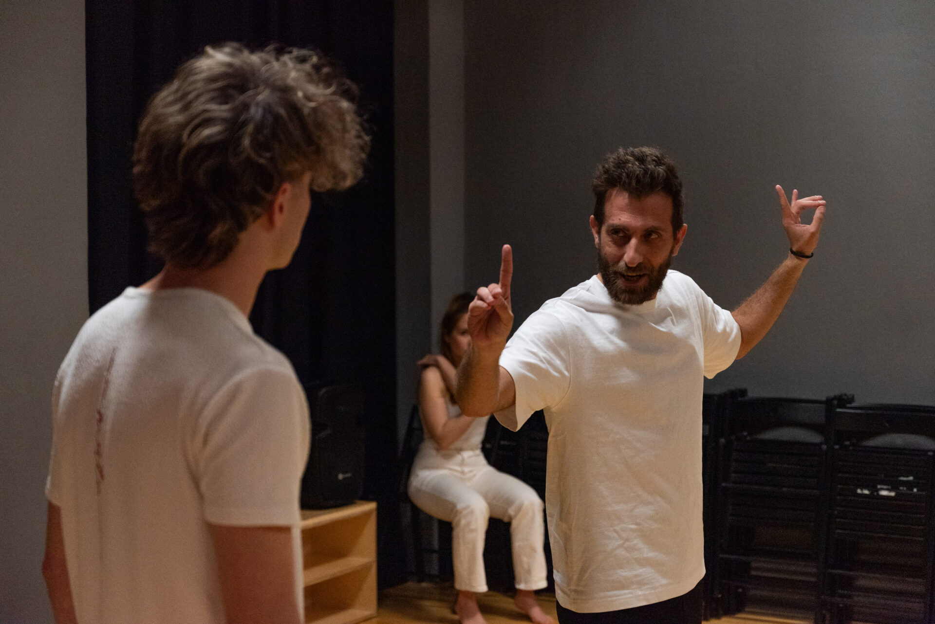 Έχω κάνει την μετάφραση και την επιμέλεια με τη βοήθεια άλλων ανθρώπων, έχω κάνει τη σκηνοθεσία και τα εικαστικά – γραφιστικά. Η σκηνοθεσία έχει δύο σημεία. Το σημείο του κενού, που είναι ένας χώρος μη χώρος στον οποίο απλά αιωρούμαστε. Όλοι έχουμε έναν τέτοιο στο μυαλό μας. Όπου απλά αιωρούμαστε και ο χρόνος διαστέλλεται. Από εκεί και πέρα έχουμε και πάρα πολλές αναμνήσεις. Ο σκοπός που ήθελα να δείξω τις αναμνήσεις είναι γιατί πρόκειται για ένα έργο αποτύπωσης του εγκεφάλου για μένα. Είναι όλες οι αναμνήσεις μας και αυτά που μαθαίνουμε. Έχουμε μία θολή εικόνα και θυμόμαστε συνήθως πολύ συγκεκριμένες φόρμες των πραγμάτων. Ακόμα και για μία χθεσινή ανάμνηση. Υπάρχουν πάντα πολλά θολά σημεία που τα γεμίζουμε εμείς με το προσωπικό μας στοιχείο. Και αυτό το βασικό κομμάτι ήταν που ήθελα να δείξω εγώ στις αναμνήσεις. Οπότε έχω διαλέξει συγκεκριμένες φόρμες κινησιολογικές οι οποίες ταιριάζουν όλες μαζί, αλλά είναι και τελείως διαφορετικές γιατί κάθε ήρωας βλέπει πολύ διαφορετικά την ανάμνησή του. Οπότε έχω βάλει πολύ συγκεκριμένα κινησιολογικά μοτίβα και συγκεκριμένα ακουστικά μοτίβα. Τα οποία καθολικά δίνουν μία αίσθηση το πώς αποτυπώνει ο κάθε ήρωας την ανάμνησή του. Χωρίς να πάμε σε έναν άκρατο ρεαλισμό ή νατουραλισμό. Νομίζω ότι αυτό είναι και το πιο ενδιαφέρον γιατί όταν αφήσεις αυτό το μικρό θολό στοιχείο, τότε και ο θεατής μπορεί να πει εύκολα ότι αυτό ταιριάζει ανάλογα τη στιγμή και την ανάμνηση. Θέλω λοιπόν να είναι τόσο ασαφή, που να μπορείς να συνδεθείς ως θεατής και τόσο σαφή σε συγκεκριμένους, γιατί δεν είναι ο σκοπός μου η ταύτιση με έναν ήρωα. Αλλά να πάρει ο θεατής μικρά σημεία από τη ζωές του κάθε ήρωα.