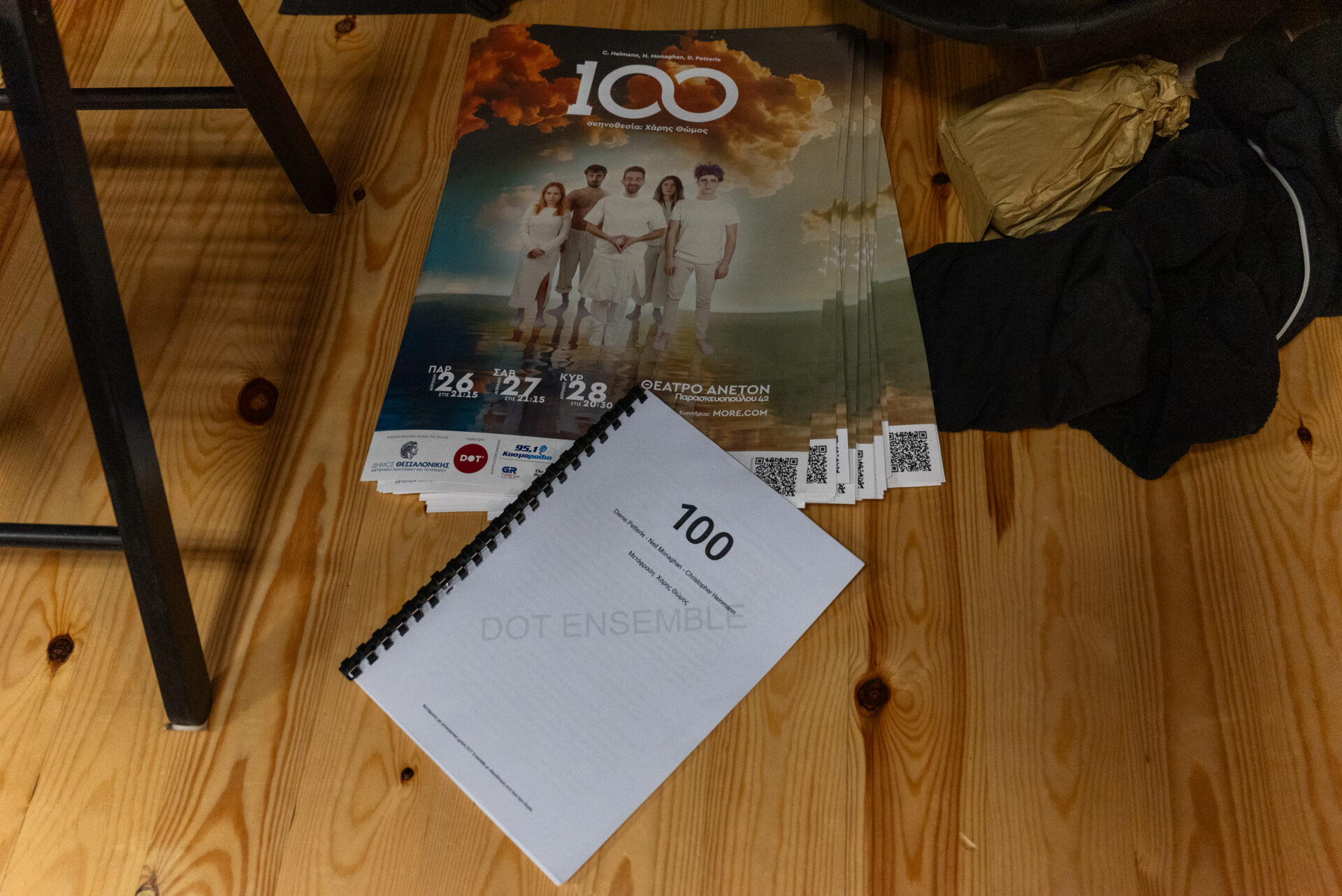 Μπήκαμε σε μία από τις τελευταίες πρόβες της παράστασης «100», λίγο πριν παρουσιαστεί στο κοινό της Θεσσαλονίκης και παρακολουθήσαμε όλα όσα ετοίμασε η Εταιρεία Θεάτρου & Πολιτισμού DOT Ensemble, σε μία θεατρική δουλειά που, στο λίγο παραπάνω από 60 λεπτά διάρκεια της, συνδυάζει την αφήγηση με το σωματικό θέατρο, γεμάτη ταλέντο και δημιουργία για ένα έργο γεμάτο νοήματα και λόγους να σκεφτούμε – άλλοτε σοβαρά και άλλοτε γλυκά – τις ζωές και τις αναμνήσεις μας, με πέντε εξαιρετικούς ηθοποιούς επί σκηνής, έναν μουσικό και ζωντανή μουσική, φώτα που δείχνουν να συμπρωταγωνιστούν και ένα κείμενο που μοιάζει να χτυπάει σαν μαχαίρι τον θεατή. Όχι για να τον πληγώσει, αλλά να τον κάνει να σκεφτεί τι κάνει και τι δεν κάνει στη ζωή του που τρέχει…