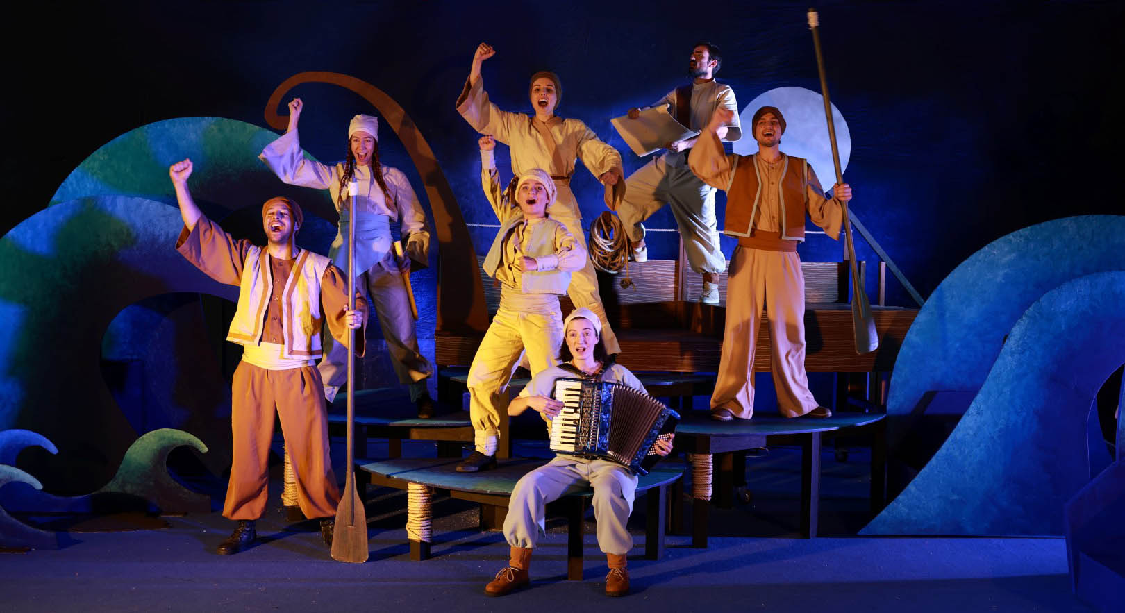 Διανομή: Οδυσσεβάχ- Μαϊμού: Θάνος Πουμάκης | Μαρούφ – Γάτος- Πελάτης στην ταβέρνα: Θανάσης Τζιντζιός | Αγήνωρ – Αρχισαλαχαρ- Σκύλος- Πειρατής – Αμαντούρ Αμαντούρ- Ταβερνιάρης: Βαγγέλης Καλλίτσογλου | Κιρκίλα- Λαριζάντ- Σειρήνα – Δρακόπουλο – Ναύτης: Χριστίνα Χαλκιά | Γοργόνα Πριμαντόνα- Λωτοφάγος- Ελάφι – Υπηρέτης Αμαντούρ – Γιος- Ναύτης: Κορνηλία Προκοπίου | Σειρήνα- Λωτοφάγος- Πειρατής – Δρακόπουλο – Λιονταρι- Βασιλιάς- Περαστική- Ναύτης: Μυρτώ Μητσοπούλου | Παραμυθού – Μουσικός επί σκηνής – Καλχουλαμόντας- Υπηρέτης του παλατιού: Λυδία Ανεστοπούλου