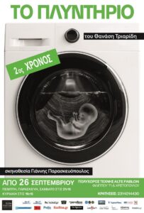 Ακόμη μια παράσταση που συνεχίζει και αυτή τη σεζόν στην πόλη μας αποτελεί έργο του συγγραφέα Θανάση Τριαρίδη, που ομολογουμένως έχει την τιμιτική του αυτή την πολιτιστική χρονιά στα θεατρικά δρώμενα της πόλης μας. Η παράστασή το «Πλυντήριο» επιστρέφει, και όπως το ίδιο το σημείωμα του συγγραφέα φανερώνει, το έργο δεν είναι απλώς ένα θεατρικό κείμενο – είναι ένα σήμα κινδύνου για την ηθική κατάπτωση της κοινωνίας και την υποκρισία του “καλού” ανθρώπου της Δύσης.