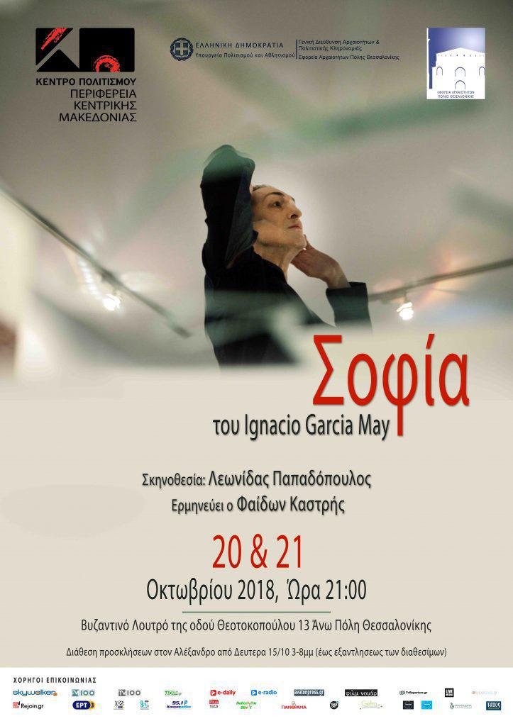 Το Κέντρο Πολιτισμού της Περιφέρειας Κεντρικής Μακεδονίας σε συνεργασία με την Εφορεία Αρχαιοτήτων Πόλης Θεσσαλονίκης παρουσιάζουν για δεύτερη χρονιά το βραβευμένο έργο του Ιγνάθιο Γκαρθία Μάι «Σοφία», σε ένα ιδιαίτερο χώρο, μυσταγωγικό, γεμάτο ιστορία και μνήμες που τόσο σοφά δένει με την παράσταση, στο Βυζαντινό Λουτρό της οδού Θεοτοκοπούλου στην Άνω πόλη της Θεσσαλονίκης.