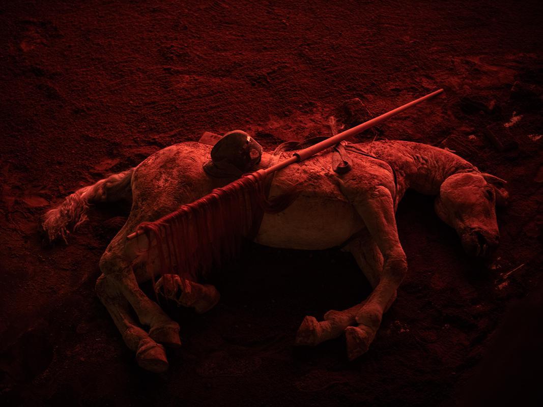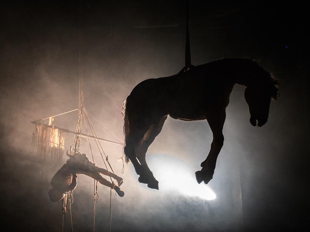 Η performance βασίζεται περισσότερο στο εικαστικό και το παραστατικό κομμάτι. Μάλιστα, τα μόνα λόγια που ακούγονται είναι στα γερμανικά με υπέρτιτλους. Πώς εναποτίθεται λοιπόν στην εικόνα το λογοτεχνικό έπος του Θερβάντες; Ποια είναι τα κύρια στοιχεία με τα οποία στήνεται και ζωντανεύει το σύμπαν του Δον Κιχώτη πάνω στη σκηνή;