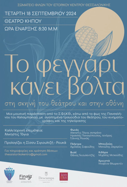 Μια μουσική παράσταση από το Σωματείο Φίλων του Ιστορικού Κέντρου της Θεσσαλονίκης, κάτω από το φως της Πανσελήνου του Καλαμποκιού, με αγαπημένα τραγούδια του θεάτρου, του κινηματογράφου και της τηλεόρασης.
