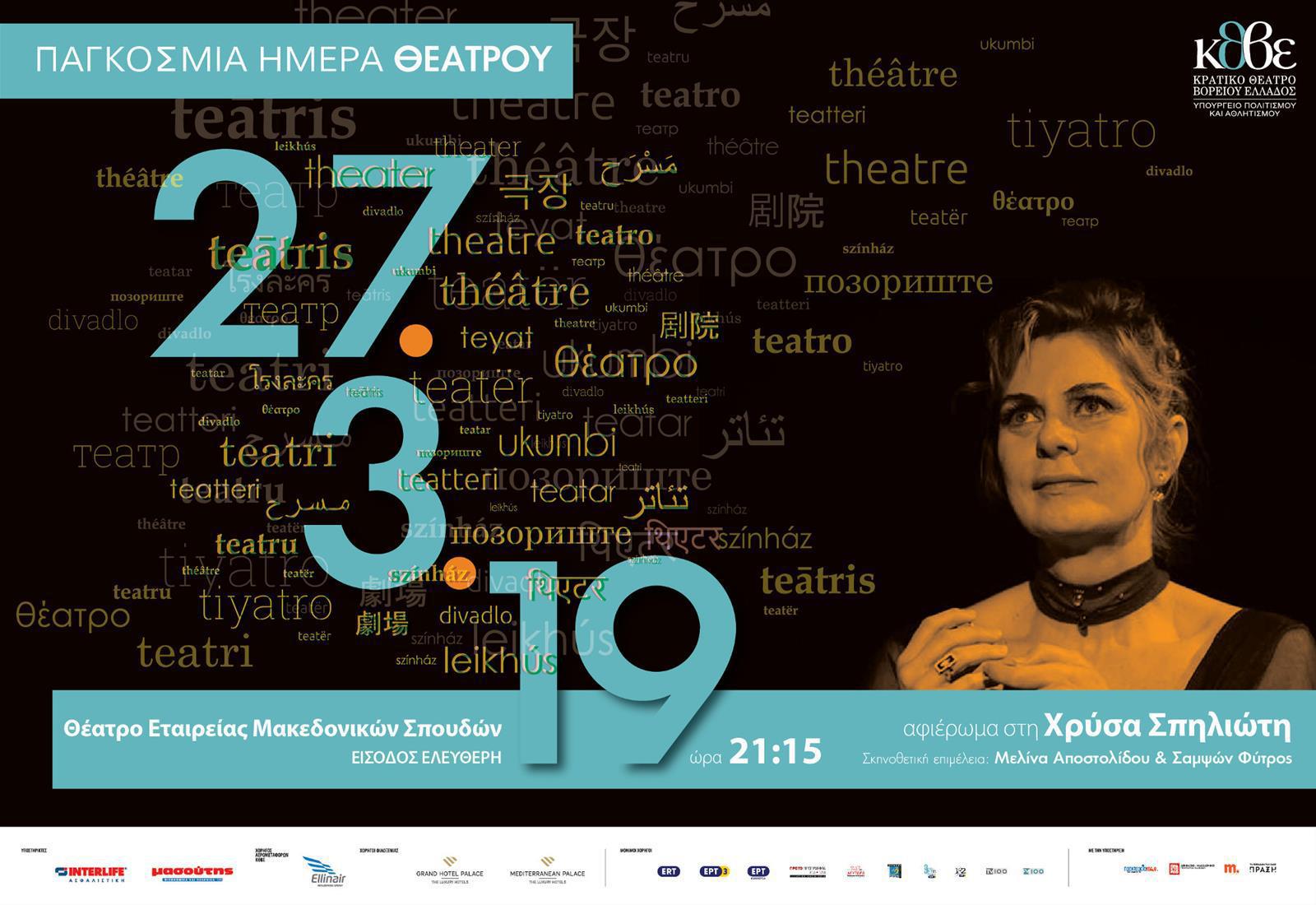 Tο Κρατικό Θέατρο Βορείου Ελλάδος θα γιορτάσει την Παγκόσμια Ημέρα Θεάτρου σήμερα με ένα αφιέρωμα στη Χρύσα Σπηλιώτη, που υπηρέτησε το σύγχρονο ελληνικό θέατρο, ως ηθοποιός, θεατρική συγγραφέας, σεναριογράφος, σκηνοθέτης και παιδαγωγός, την Τετάρτη 27 Μαρτίου 2019, στις 21:15 στην Εταιρεία Μακεδονικών Σπουδών.