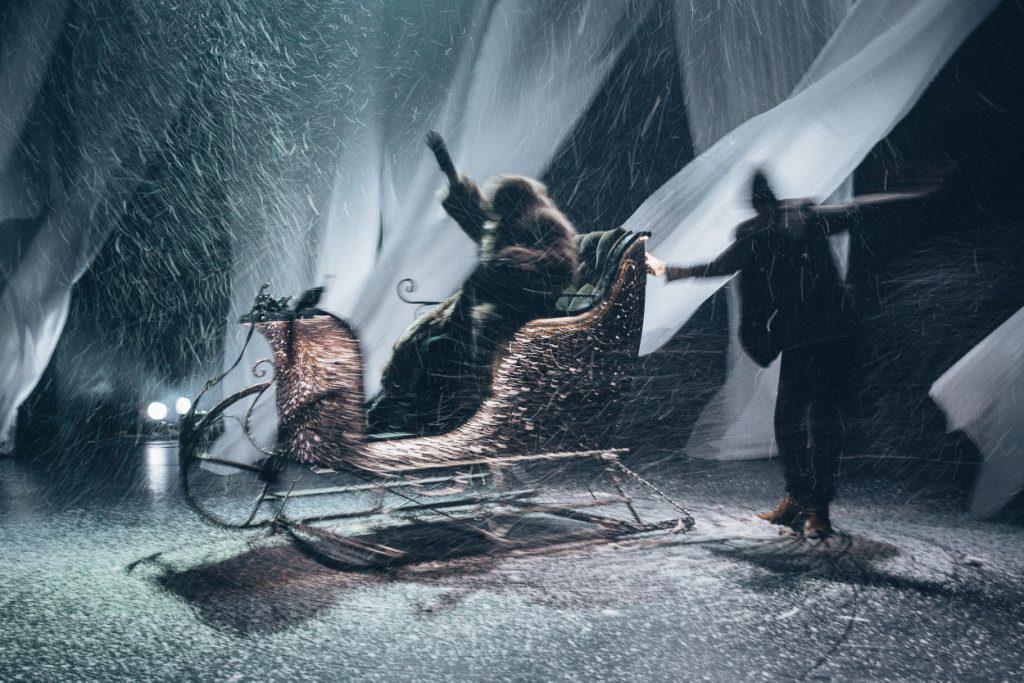 Ειδική ωστόσο αναφορά αρμόζει στο σκηνικό της σχεδίασμα που απελευθέρωνε την εικόνα του χιονισμένου τοπίου, αφήνοντας να εισβάλει στην αίθουσα πιο έντονα αυτό που βίωναν οι χαρακτήρες. Εύστοχες και οι ριπές χιονιού που μαστίγωναν τους δύο ήρωες. Όπως και η εικόνα με τις λευκές κουρτίνες να πέφτουν ξαφνικά και να σχηματίζουν μια σωρό που έκανε ακόμη πιο απειλητικό το τοπίο, καθώς έδειχνε την υπεροχή της Φύσης, όπως εξαφάνιζε το ανθρώπινο στοιχείο. Το απομονώνω για σχολιασμό αυτό, γιατί είναι μια σημαντική στιγμή στο έργο, δεδομένου ότι από αυτό το σημείο και μετά οι ήρωες, εντελώς αποπροσανατολισμένοι, κάνουν κύκλους όχι μόνο τοπογραφικούς αλλά και συμβολικούς, δηλαδή κύκλους γύρω από τον εαυτό τους μέχρι να ανακαλύψουν το νόημα της ζωής τους (θυμίζω την έντονη σκηνή με τον δούλο να σπρώχνει κατάκοπος την άμαξα γύρω-γύρω).