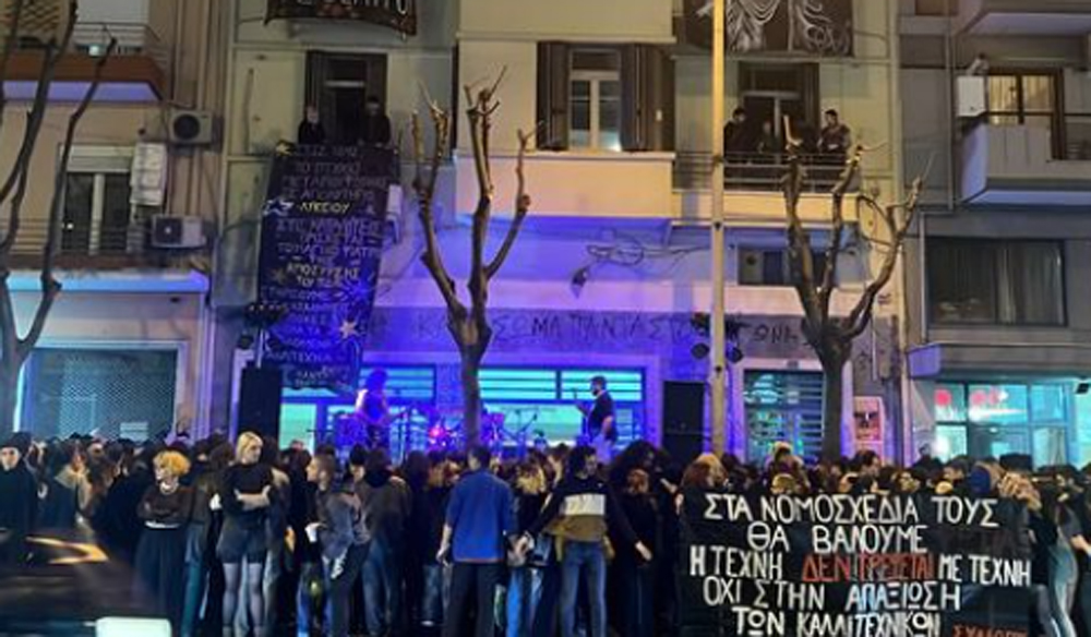 Μεγάλη συναυλία διαμαρτυρίας πραγματοποιείται αυτή την ώρα, ενάντια στην υποβάθμιση της τέχνης από φοιτητές του τμήματος Θεάτρου της Σχολής Καλών Τεχνών του ΑΠΘ, που τελεί υπό κατάληψη, έξω από το κτήριό τους, επί της Εγνατίας, στο κέντρο της Θεσσαλονίκης.