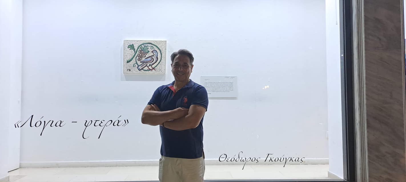Στη βιτρίνα με τίτλο «Ψηφίδες» ο Θεόδωρος Γκούγκας παρουσιάζει ένα ψηφιδωτό, με σύμβολα της φύσης, ένα πουλί και ένα αμπέλι. «Συμβολίζουν την ελπίδα αλλά και τη γονιμότητα. Εμπνέεται από την αρχαία τέχνη και τα πήλινα αγγελία στα οποία ήταν απεικονισμένη η άμπελος και τα οποία είχαν αναφορές στις γιορτές προς τιμήν του θεού Διόνυσου και στη θεά Δήμητρα», επισημαίνει η κ. συγγραφέας. «Με αυτήν την τεχνική θέλει να συνδέσει αυτά τα σύμβολα με την σημερινή ζωή και να αναδείξει πόσο μεγάλη σχέση έχει η αρχαία εποχή με τη σημερινή», συμπληρώνει.