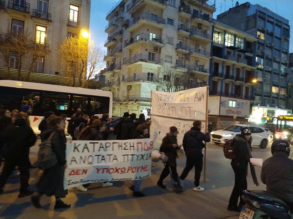 Πορεία πραγματοποιείται αυτή την ώρα στο κέντρο της πόλης από τους σπουδαστές και τις σπουδάστριες της Δραματικής Σχολής του Κρατικού Θεάτρου Βορείου Ελλάδος, καθώς και άλλων καλλιτεχνικών σχολών, όπως και καλλιτεχνών και απλού κόσμου που θέλησε να δείξει την συμπαράσταση του στην αδικία του ΠΔ που εξισώνει τα καλλιτεχνικά πτυχία με τα απολυτήρια λυκείου.