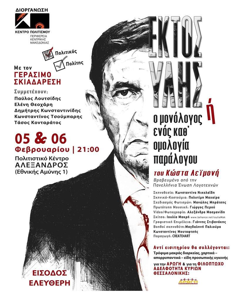 Το θεατρικό έργο του Κώστα Λεϊμονή “Εκτός Ύλης” με πρωταγωνιστή τον Γεράσιμο Σκιαδαρέση, ανεβαίνει στις 5 και 6 Φεβρουαρίου στο Πολιτιστικό Κέντρο Αλέξανδρος.