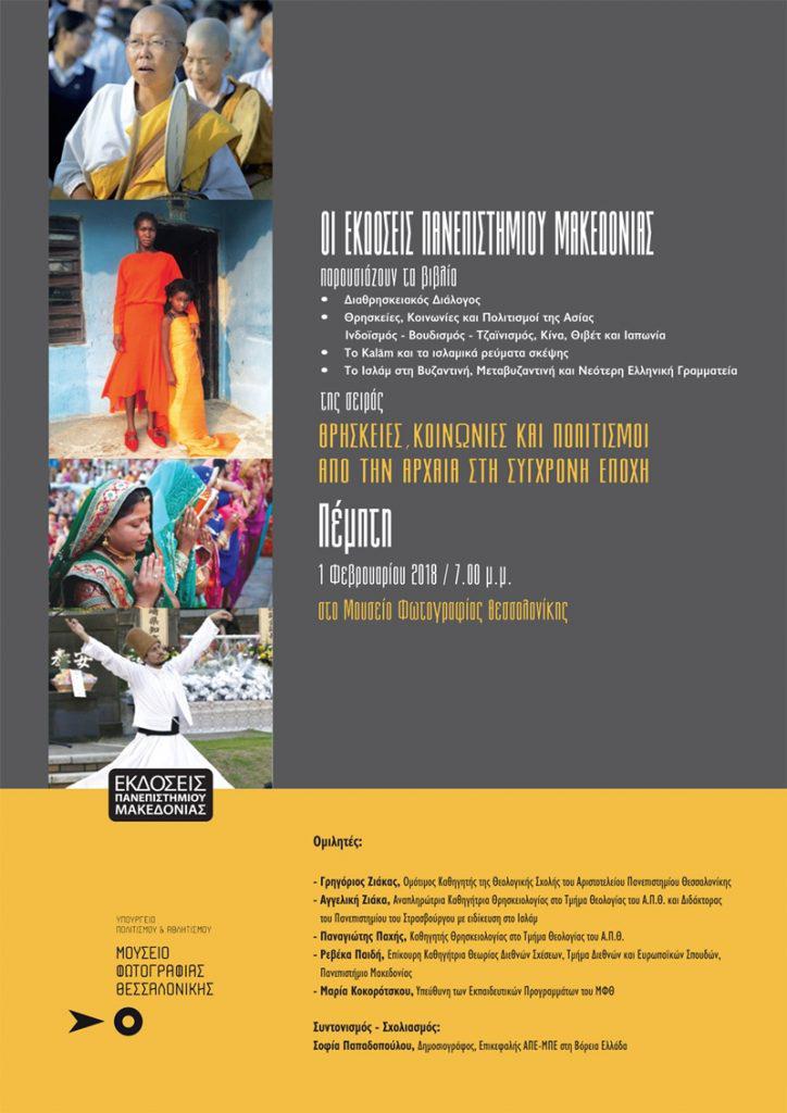 Οι Εκδόσεις Πανεπιστημίου Μακεδονίας παρουσιάζουν τα βιβλία της σειράς «Θρησκείες, Κοινωνίες και Πολιτισμοί από την Αρχαία στη Σύγχρονη Εποχή» στο χώρο του Μουσείου Φωτογραφίας Θεσσαλονίκης, την Πέμπτη, 1η Φεβρουαρίου 2018.