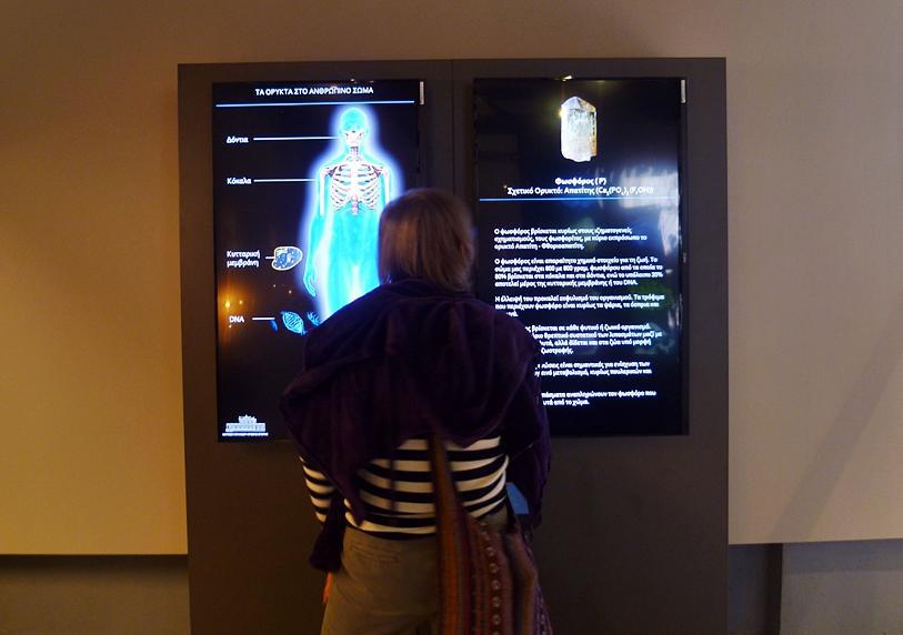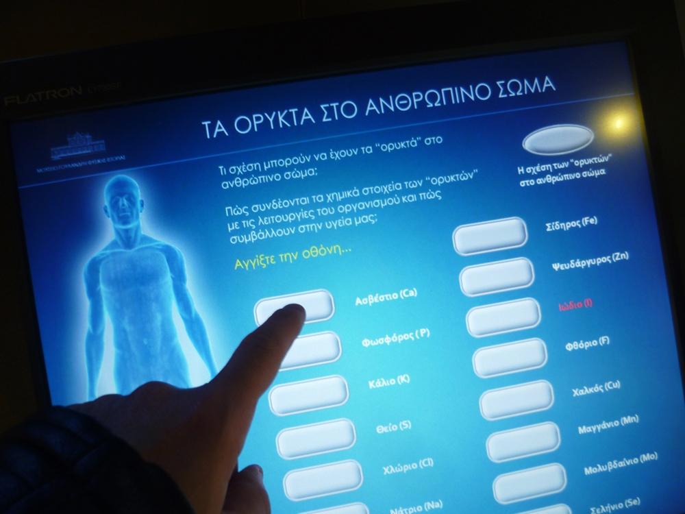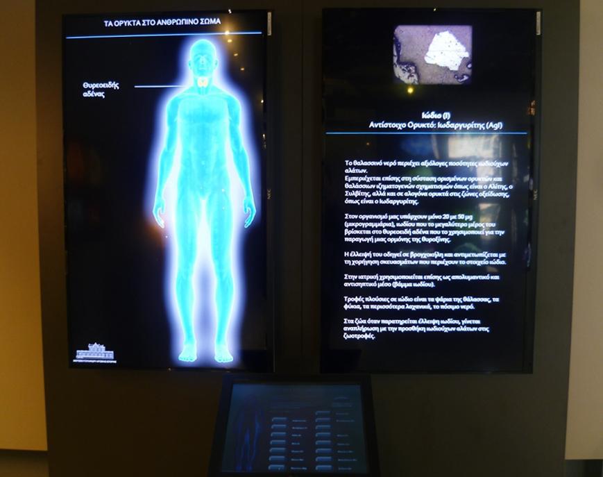 «Στη συνέχεια, ένα μέρος της έκθεσης αφορά τα μεταλλεύματα και πού χρησιμοποιούνται στη ζωή μας, ένα μέρος τα βιομηχανικά ορυκτά και ένα μέρος τα λατομικά πετρώματα και τα ενεργειακά πετρώματα και ορυκτά, βασικά ο λιγνίτης. Και υπάρχει και ένα τμήμα, το οποίο αφορά το σώμα μας», σημειώνεται μιλώντας για την διαδραστική εγκατάσταση που υπάρχει στην έκθεση, όπου κάθε επισκέπτης μπορεί πατώντας σε μια οθόνη πάνω σε σημεία του ανθρώπινου σώματος μπορεί να δει τι μέταλλα βρίσκει σε αυτό. «Είναι πολύ ωραίο ένας επισκέπτης να βλέπει το σώμα του τι σπάνια μέταλλα έχει. Σε απειροελάχιστες ποσότητες, που παίζουν όμως πάρα πολύ μεγάλο ρόλο στην ισορροπία του οργανισμού μας» προσθέτει ο κ. Μέλφος.