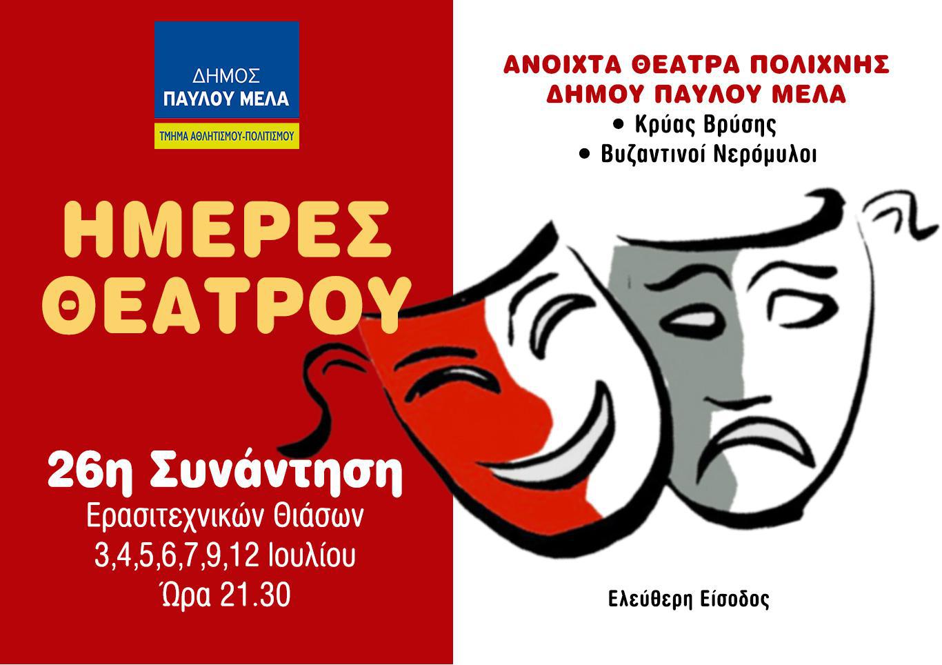 Το Τμήμα Πολιτισμού – Αθλητισμού, με την 26η Συνάντηση Ερασιτεχνικών θιάσων, δίνει τη δυνατότητα στο κοινό να απολαύσει θεατρικές δημιουργίες από καλλιτεχνικές δυνάμεις της Βόρειας Ελλάδος, στις 3,4,5,6,7,9 Ιουλίου 2017, στο Ανοιχτό Θέατρο Κρύας Βρύσης και η αυλαία θα πέσει στις 12 Ιουλίου σε έναν άλλο εξαιρετικό πολιτιστικό χώρο, στο Ανοιχτό Θέατρο των Βυζαντινών Νερόμυλων, όπου θα φιλοξενηθεί ο γνωστός κωμικός Τάσος Παλαντζίδης, που γεννήθηκε και μεγάλωσε στην Πολίχνη του Δήμου Παύλου Μελά, σε ένα έργο γραμμένο με τις φιλικές υποδείξεις του Λάκη Λαζόπουλου.