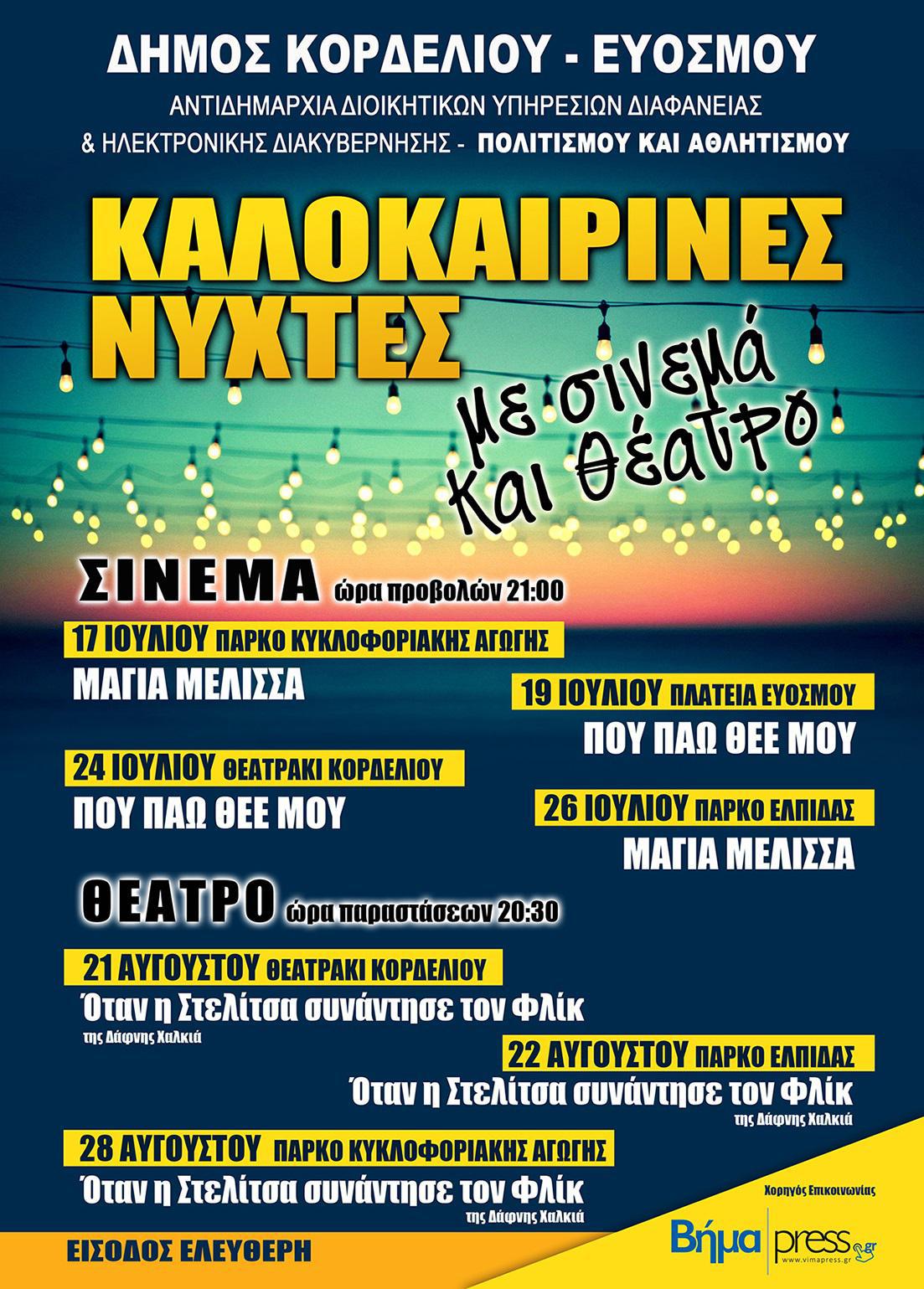 Βραδιές γεμάτες κινηματογράφο και θέατρο κάτω από τον έναστρο ουρανό επιφυλάσσει το πρόγραμμα των καλοκαιρινών εκδηλώσεων που διοργανώνει ο Δήμος Κορδελιού Ευόσμου δια της Αντιδημαρχίας Διοικητικών Υπηρεσιών, Διαφάνειας και Ηλεκτρονικής Διακυβέρνησης, Πολιτισμού και Αθλητισμού τους μήνες Ιούλιο και Αύγουστο. Στόχος των εκδηλώσεων η δημιουργία τοπικών πυρήνων πολιτισμού στις γειτονιές και στις πλατείες του Δήμου, η ποιοτική διασκέδαση και η εναλλακτική ψυχαγωγία των μικρών και μεγάλων δημοτών που θα παραμείνουν στην πόλη.