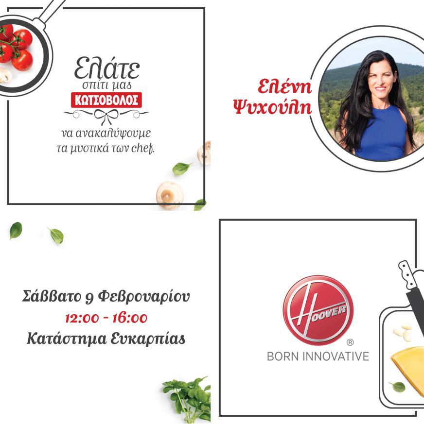 Το Σάββατο 09.02 από τις 12:00 έως τις 16:00 στην κουζίνα της HOOVER, θα βρεθεί η Ελένη Ψυχούλη για να ετοιμάσει «γλυκά» εδέσματα με αφορμή τη γιορτή των ερωτευμένων και να προτείνει ιδιαίτερες συνταγές ειδικά για το έτερον ήμισυ.