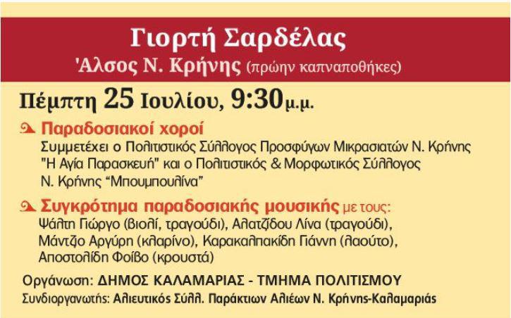 Μετά την περσινή αναβολή της εκδήλωσης λόγω πένθους για την τραγωδία στο Μάτι Αττικής, φέτος η Γιορτή Σαρδέλας προγραμματίζεται για την Πέμπτη 25 Ιουλίου στο Άλσος Ν. Κρήνης (πρώην Καπναποθήκες).