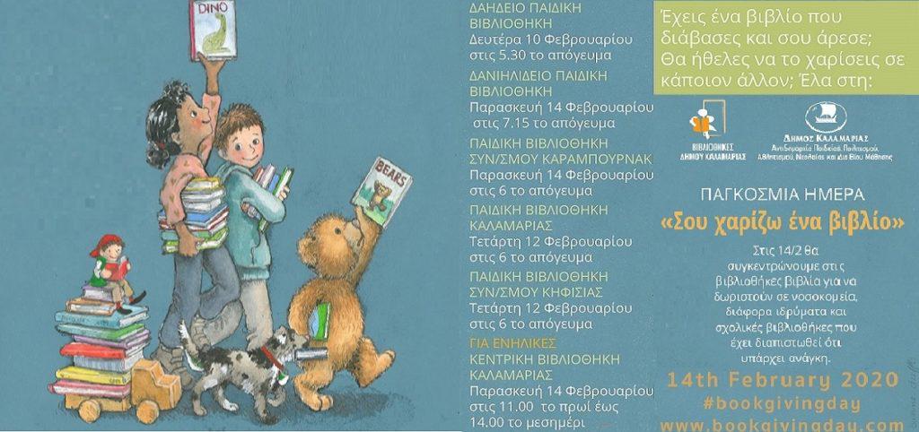 Οι Βιβλιοθήκες του Δήμου Καλαμαριάς γιορτάζουν την Παγκόσμια Ημέρα «Σου χαρίζω ένα βιβλίο» και σε καλούν να συμμετέχεις σ΄ αυτή τη γιορτή. Έχεις ένα βιβλίο που διάβασες και σου άρεσε; Θα ήθελες να το χαρίσεις σε κάποιον άλλον; Τότε έλα σε μία από τις βιβλιοθήκες του δήμου, μίλησε για το βιβλίο σου και χάρισε το.