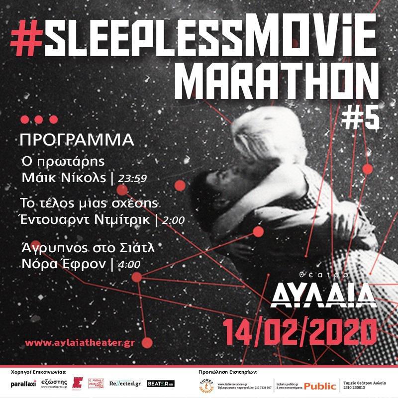 To 5ο Sleepless Movie Marathon και το πιο «γλυκό» έρχεται στις 14 Φεβρουαρίου και προβάλει 3 ταινίες με θέμα τον έρωτα. Οπότε πάρτε το ταίρι σας και περάστε μια διαφορετική μέρα του Αγίου Βαλεντίνου. Πρώτη προβολή το αριστούργημα του Μάικ Νίκολς, Ο Πρωτάρης (1967) με τις εκπληκτικές ερμηνείες των Ντάστιν Χόφμαν και της Αν Μπάνκροφτ. Στη συνέχεια την σκυτάλη παίρνει Το τέλος μιας Σχέσης (1955) του Εντουαρντ Ντμίτρικ ένα από τα μεγαλύτερα διαμάντια του παγκόσμιου κινηματογράφου. Η τελευταία προβολή του κινηματογραφικού μαραθωνίου πρόκειται για το ρομαντικό Άγρυπνος στο Σιάτλ (1993) της Νόρα Έφρον μια αισθηματική κομεντί που όποτε την δούμε μας προκαλεί ένα γλυκό σκίρτημα.