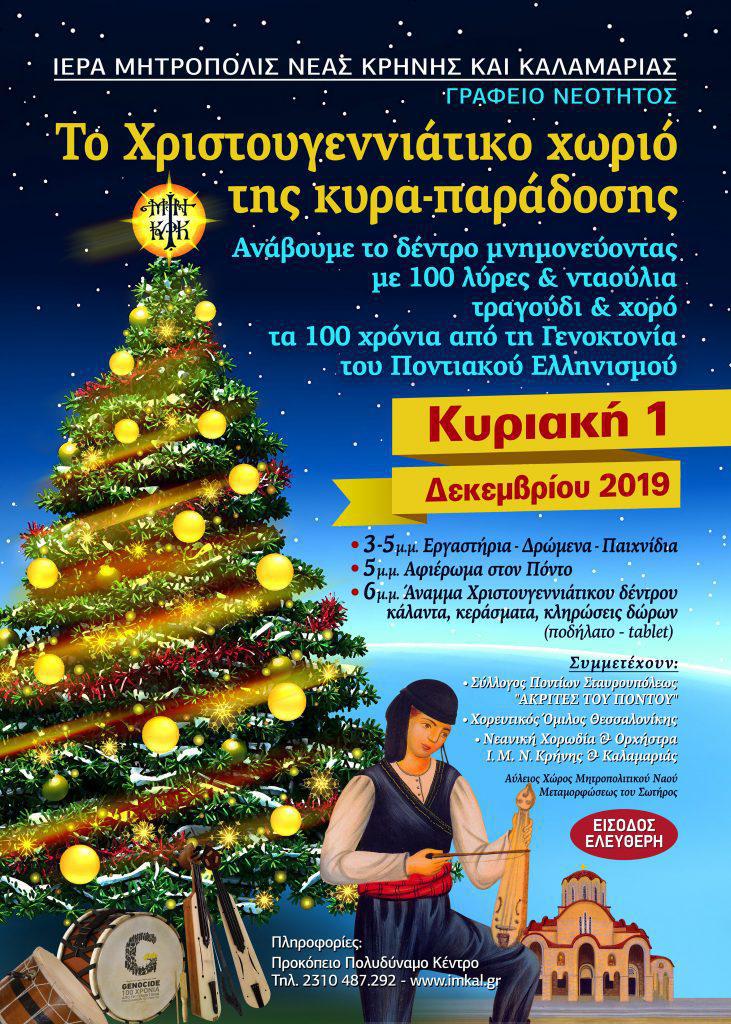Την Κυριακή, 1 Δεκεμβρίου και ώρα 3:00 μ.μ. ανοίγει και φέτος τις πύλες του το Χριστουγεννιάτικο χωριό της Κυρά – Παράδοσης στον Αύλειο χώρο του Μητροπολιτικού Ναού Μεταμορφώσεως του Σωτήρος Καλαμαριάς με ένα ειδικό αφιέρωμα: «Ανάβουμε το Χριστουγεννιάτικο δέντρο μνημονεύοντας με 100 λύρες και νταούλια, τραγούδι και χορό τα 100 χρόνια από τη Γενοκτονία του Ποντιακού Ελληνισμού». Το πρόγραμμα περιλαμβάνει: 3:00-5:00 μ.μ. Εργαστήρια κατασκευών και Χριστουγεννιάτικων διακοσμητικών, Το διαδραστικό σπίτι του Αγίου Βασιλείου, Εργαστήριο σοκολάτας, Ξυλοπόδαροι, Σκηνικά δρώμενα, Το δέντρο των ευχών, Ζωντανή μουσική από μαθητές και καθηγητές της Σχολής Βυζαντινής μουσικής και Παραδοσιακών οργάνων της Ιεράς Μητροπόλεως.