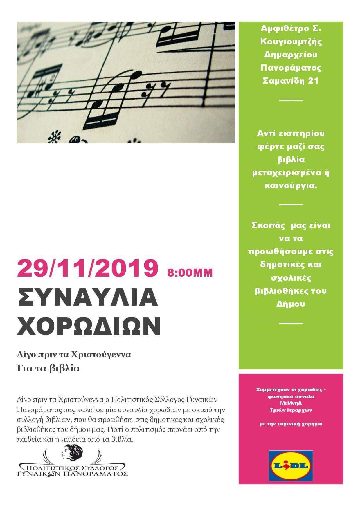 Λίγο πριν τα Χριστούγεννα, ο Πολιτιστικός Σύλλογος Γυναικών Πανοράματος σας καλεί σε μια συναυλία χορωδιών με σκοπό τη συλλογή βιβλίων, που θα προωθήσει στις δημοτικές και σχολικές βιβλιοθήκες του δήμου. Συμμετέχουν οι χορωδίες – φωνητικά σύνολα: ΜέΜνηΑ Τριών Ιεραρχών.