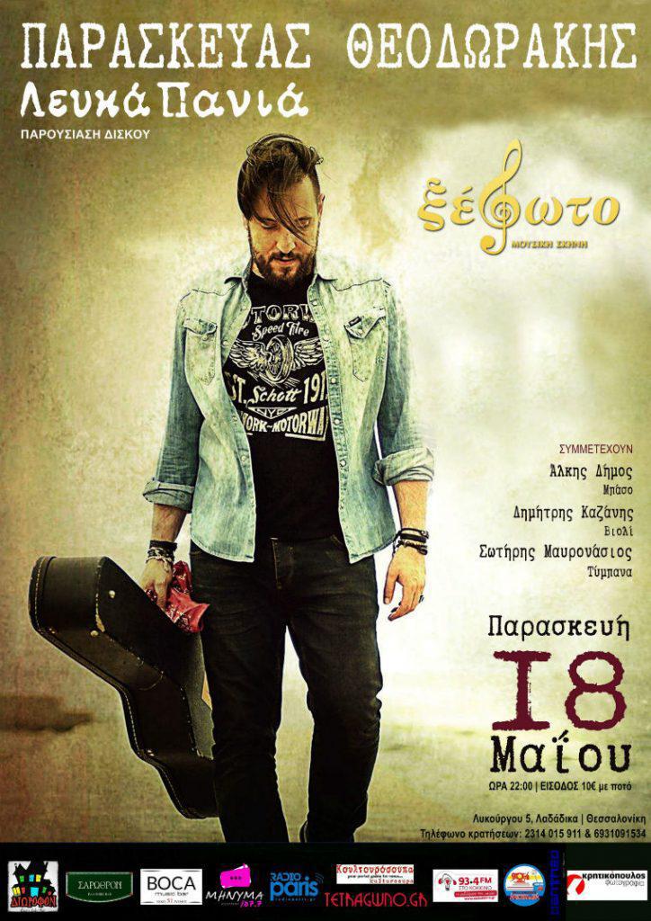 Τη νύχτα της Παρασκευής 18 Μαΐου, ο Παρασκευάς Θεοδωράκης έρχεται στο ΞΕΦΩΤΟ(Λυκούργου 5, Λαδάδικα), για να μας ταξιδέψει τραγούδια του από τη νέα δισκογραφική του δουλειά «Λευκά Πανιά» και με υπέροχα ακούσματα από την ελληνική έντεχνη και ροκ μουσική σκηνή. «Τα Λευκά Πανιά, συμβολίζουν τη νέα αρχή, την ελπίδα και την αισιοδοξία με την οποία αντιμετωπίζω τη ζωή. Τον καθημερινό αγώνα για δουλειά, δημιουργία και έκφραση, που όλοι οι νέοι καλλιτέχνες δίνουμε, κόντρα στα προβλήματα, τις ανασφάλειες και τις αντίξοες συνθήκες που βιώνουμε» λέει χαρακτηριστικά ο ίδιος.