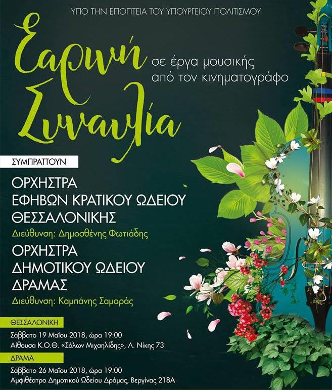 Η Ορχήστρα Εφήβων του Κρατικού Ωδείου Θεσσαλονίκης, υπό τη Διεύθυνση του Δημοσθένη Φωτιάδη, στο πλαίσιο της φετινής καλλιτεχνικής της δραστηριότητας συνεργάζεται με το Δημοτικό Ωδείο της Δράμας, σε δύο εαρινές συναυλίες, 19 Μαΐου, στη Θεσσαλονίκη, ώρα 19.00 Αίθουσα Κρατικής Ορχήστρας Θεσσαλονίκης και στις 26 Μαΐου, ώρα 19.00 στο Αμφιθέατρο Δημοτικού Ωδείου Δράμας. Τα δυο μαθητικά σύνολα (ΚΩΘ και ΔΩΔ) θα ενώσουν τις δυνάμεις τους δημιουργώντας μια ορχήστρα 80 μελών σε ένα πολύ ωραίο πρόγραμμα από γνωστές μελωδίες κινηματογραφικής μουσικής.