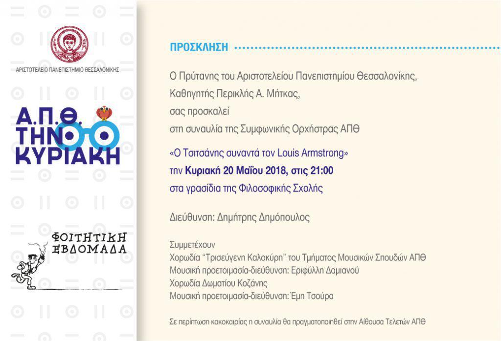 Ο Πρύτανης του Αριστοτελείου Πανεπιστημίου Θεσσαλονίκης και Καθηγητής Περικλής Α. Μήτκας σας προσκαλεί στη συναυλία της Συμφωνικής Ορχήστρας του ΑΠΘ ”Ο Τσιτσάνης συναντά τον Louis Armstrong”.