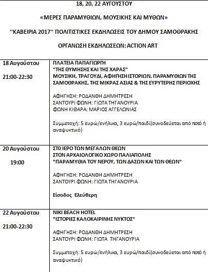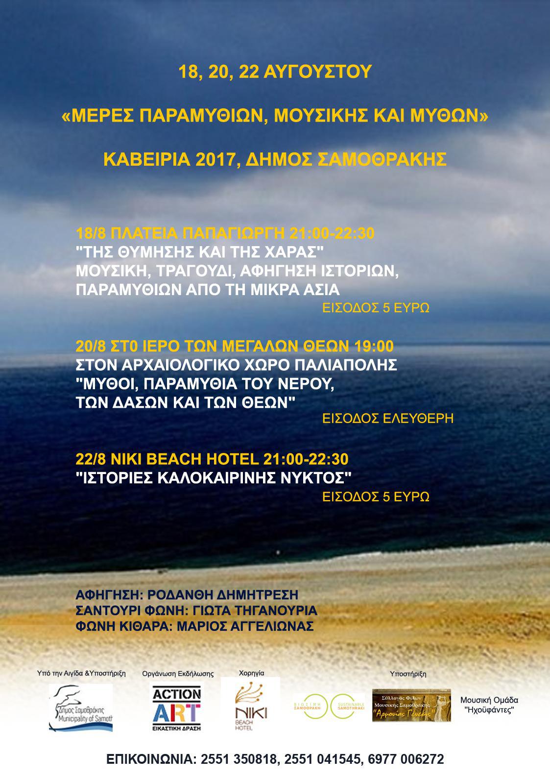Στο πλαίσιο των πολιτιστικών εκδηλώσεων του Δήμου Σαμοθράκης ”ΚΑΒΕΙΡΙΑ 2017”, η Αction Art/Εικαστική Δράση για δεύτερη χρονιά, διοργανώνει τις εκδηλώσεις ΜΕΡΕΣ ΠΑΡΑΜΥΘΙΩΝ ΜΟΥΣΙΚΗΣ & ΜΥΘΩΝ υπό την Αιγίδα και την υποστήριξη του Δήμου Σαμοθράκης, τη χορηγία του Ηotel Niki Beach, την υποστήριξη του συλλόγου Φίλων Μουσικής Σαμοθράκης «Αρμονίας Γένεσις» , της Μουσικής Ομάδας”Ηχοϋφάντες” και του συλλόγου Βιώσιμη Σαμοθράκη/Sustainable Samothraki .